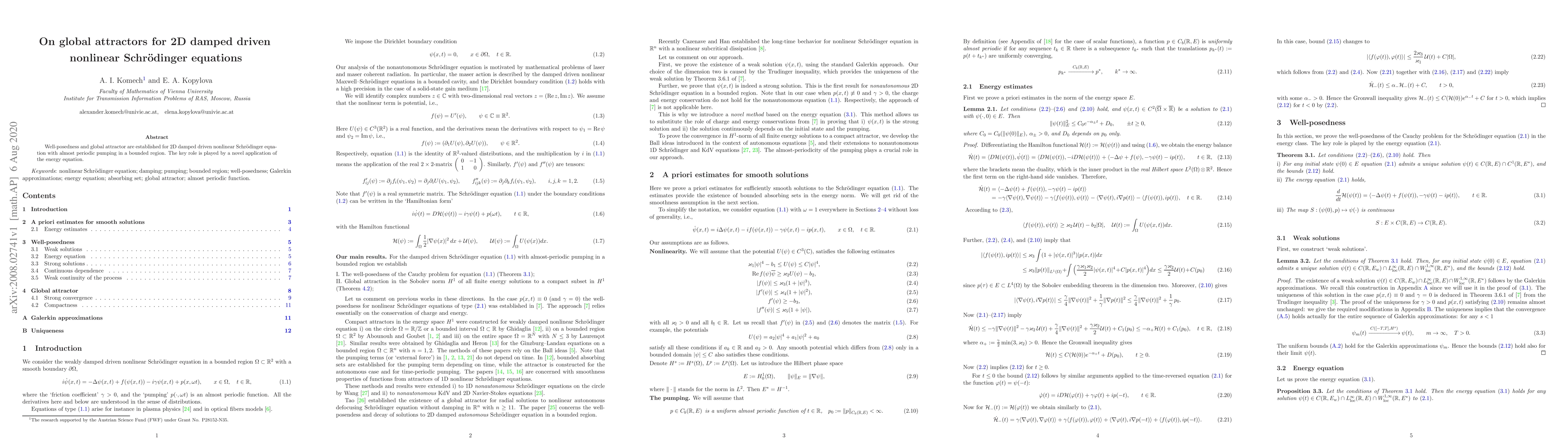 Summary: This paper establishes well-posedness and identifies a global attractor for 2D damped driven nonlinear Schrödinger equations with almost periodic pumping, utilizing a novel application of the energy equation to achieve the results.