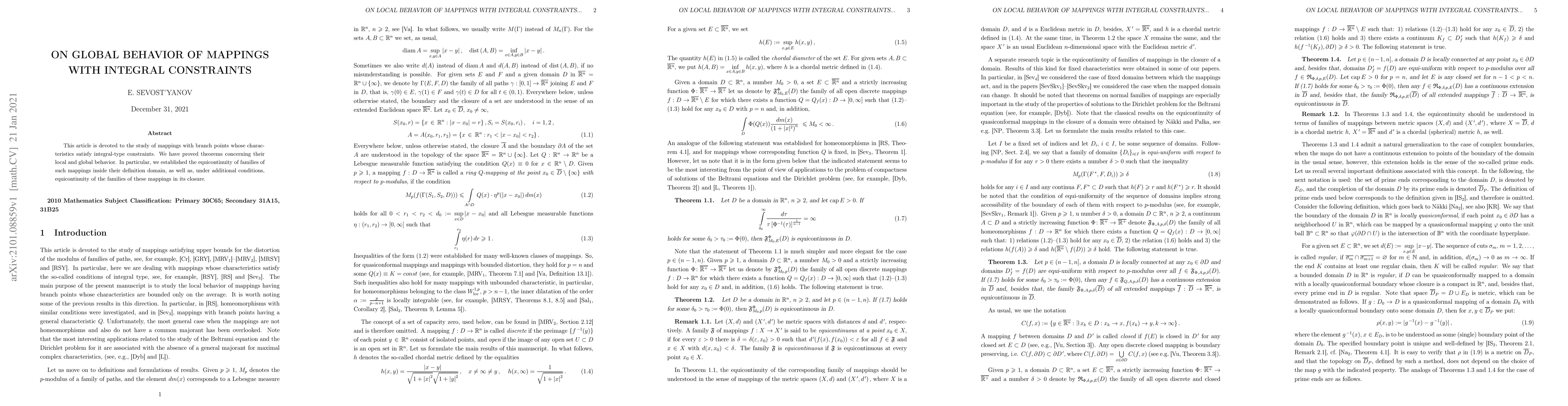 This paper investigates mappings with branch points that adhere to integral constraints, proving theorems on their local and global behavior. It establishes the equicontinuity of such mapping families within their domain and, under extra conditions, within the domain's closure.