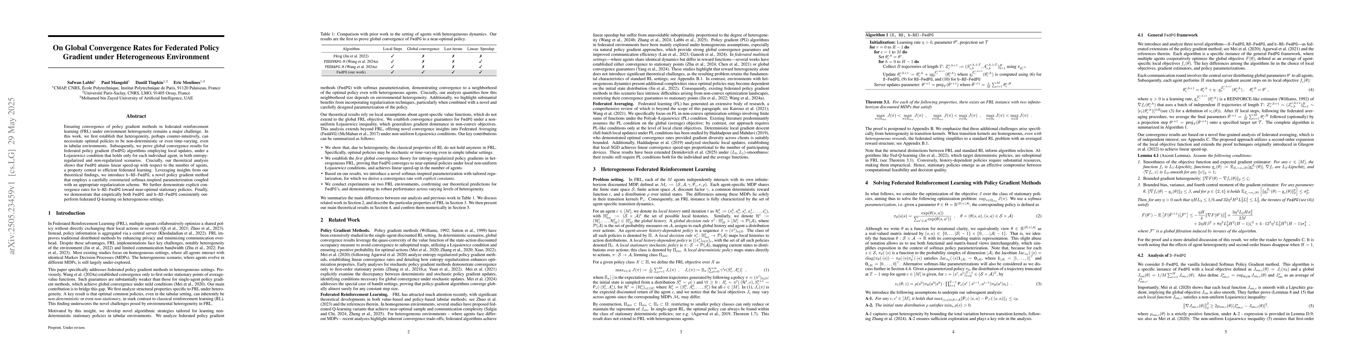 The paper presents novel theoretical insights into the convergence of federated policy gradient methods under heterogeneous environments, alongside a practical algorithm b-RS-FedPG.