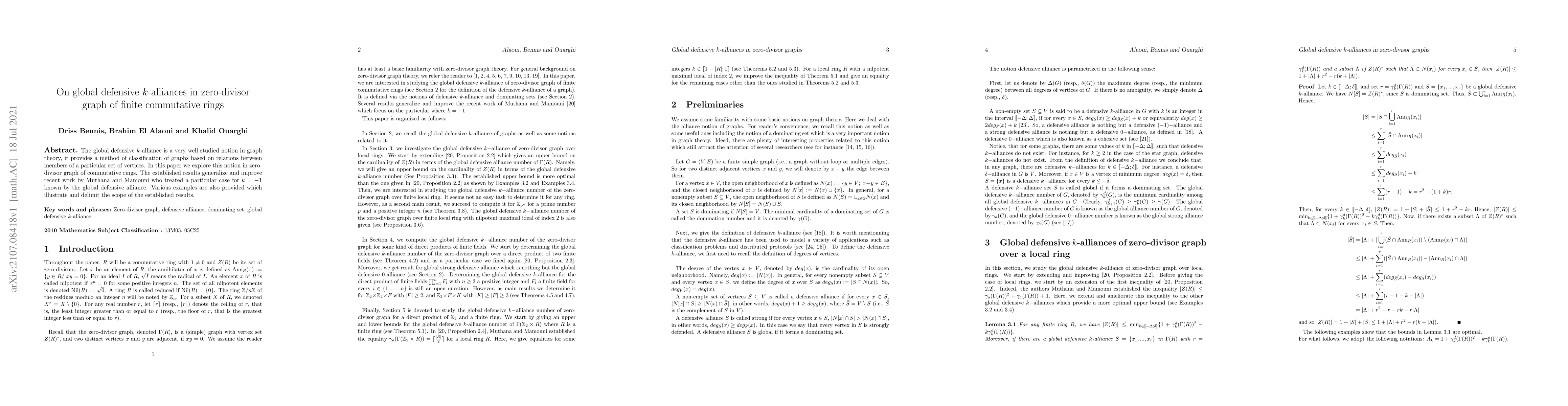 This paper investigates the concept of global defensive $k$-alliances in the context of zero-divisor graphs of finite commutative rings, extending and enhancing previous results by Muthana and Mamouni. Examples are provided to illustrate the applicability and limitations of the new findings.