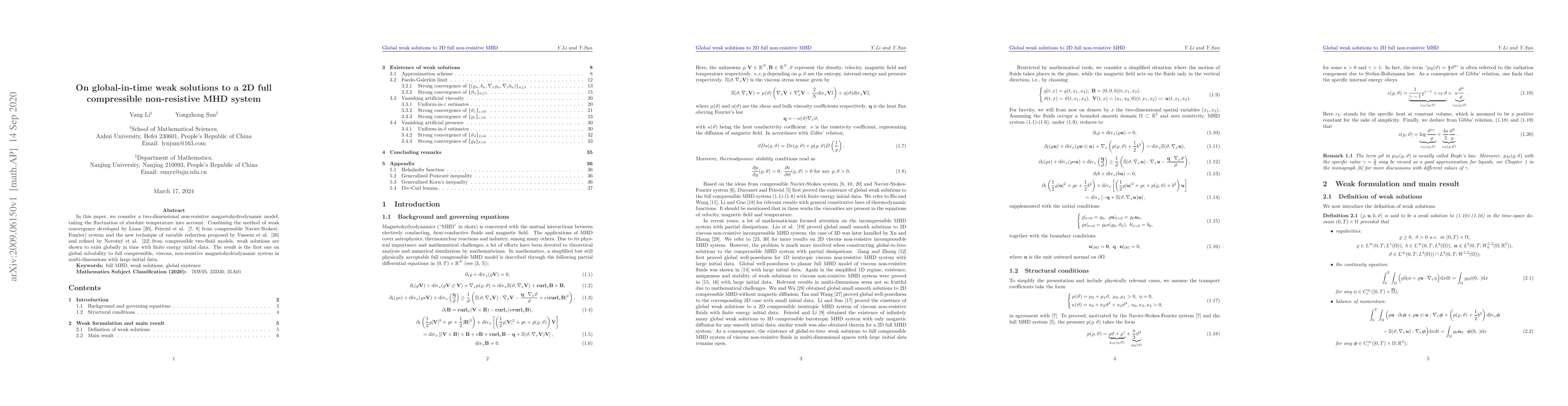 This paper establishes the existence of global-in-time weak solutions for a two-dimensional full compressible non-resistive MHD system, incorporating temperature fluctuations. The authors combine weak convergence techniques from compressible Navier-Stokes systems and a new variable reduction method from compressible two-fluid models to achieve this result.