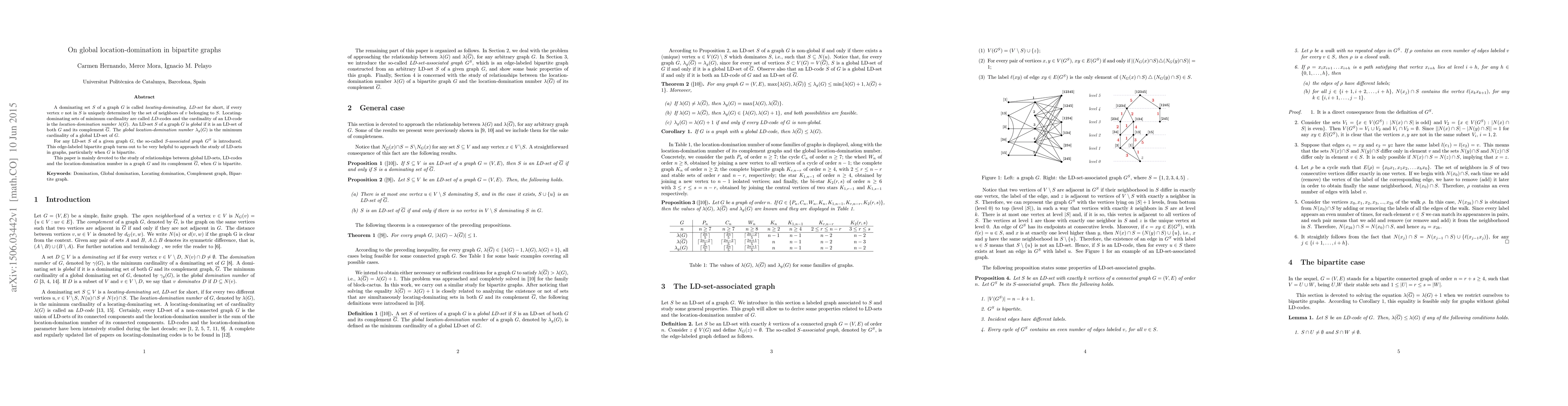 A dominating set $S$ of a graph $G$ is called locating-dominating, LD-set for short, if every vertex $v$ not in $S$ is uniquely determined by the set of neighbors of $v$ belonging to $S$. Locating-dominating sets of minimum cardinality are called $LD$-codes and the cardinality of an LD-code is the \emph{location-domination number} $\lambda(G)$. An LD-set $S$ of a graph $G$ is \emph{global} if it is an LD-set of both $G$ and its complement $\overline{G}$. The \emph{global location-domination number} $\lambda_g(G)$ is the minimum cardinality of a global LD-set of $G$. For any LD-set $S$ of a given graph $G$, the so-called \emph{S-associated graph} $G^S$ is introduced. This edge-labeled bipartite graph turns out to be very helpful to approach the study of LD-sets in graphs, particularly when $G$ is bipartite. This paper is mainly devoted to the study of relationships between global LD-sets, LD-codes and the location-domination number in a graph $G$ and its complement $\overline{G}$, when $G$ is bipartite.