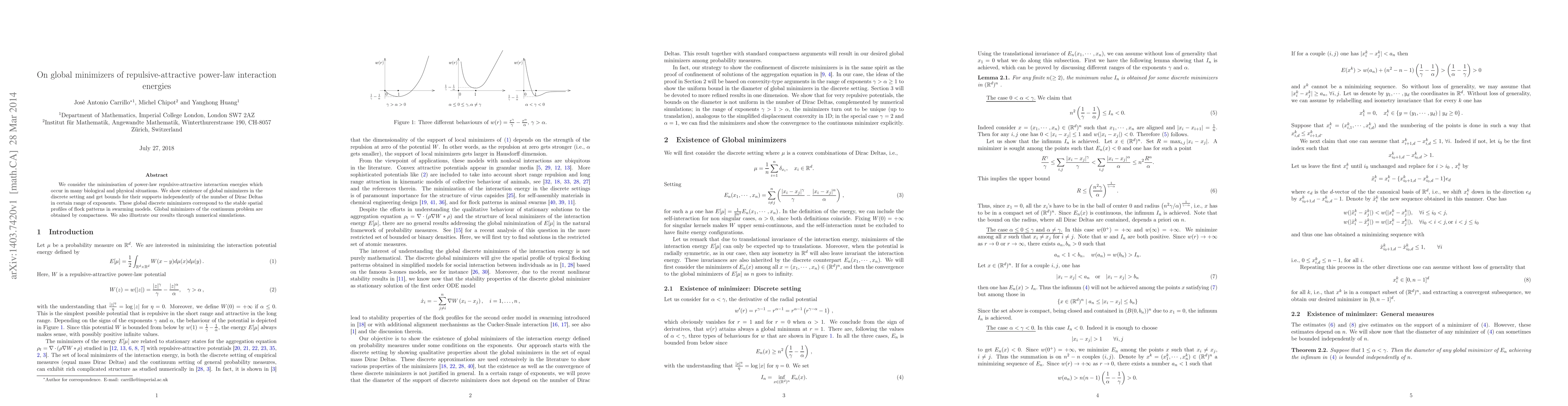 This paper demonstrates the existence of global minimizers for power-law repulsive-attractive interaction energies in both discrete and continuum settings, providing bounds for their supports. Numerical simulations illustrate stable spatial profiles in swarming models.