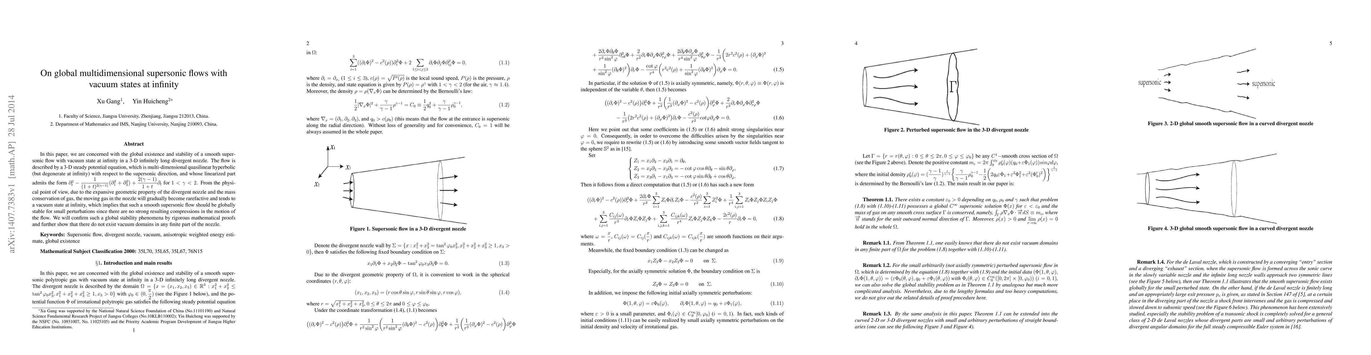 In this paper, we are concerned with the global existence and stability of a smooth supersonic flow with vacuum state at infinity in a 3-D infinitely long divergent nozzle. The flow is described by a 3-D steady potential equation, which is multi-dimensional quasilinear hyperbolic (but degenerate at infinity) with respect to the supersonic direction, and whose linearized part admits the form $\p_t^2-\ds\f{1}{(1+t)^{2(\g-1)}}(\p_1^2+\p_2^2)+\ds\f{2(\g-1)}{1+t}\p_t$ for $1<\g<2$. From the physical point of view, due to the expansive geometric property of the divergent nozzle and the mass conservation of gas, the moving gas in the nozzle will gradually become rarefactive and tends to a vacuum state at infinity, which implies that such a smooth supersonic flow should be globally stable for small perturbations since there are no strong resulting compressions in the motion of the flow. We will confirm such a global stability phenomena by rigorous mathematical proofs and further show that there do not exist vacuum domains in any finite part of the nozzle.