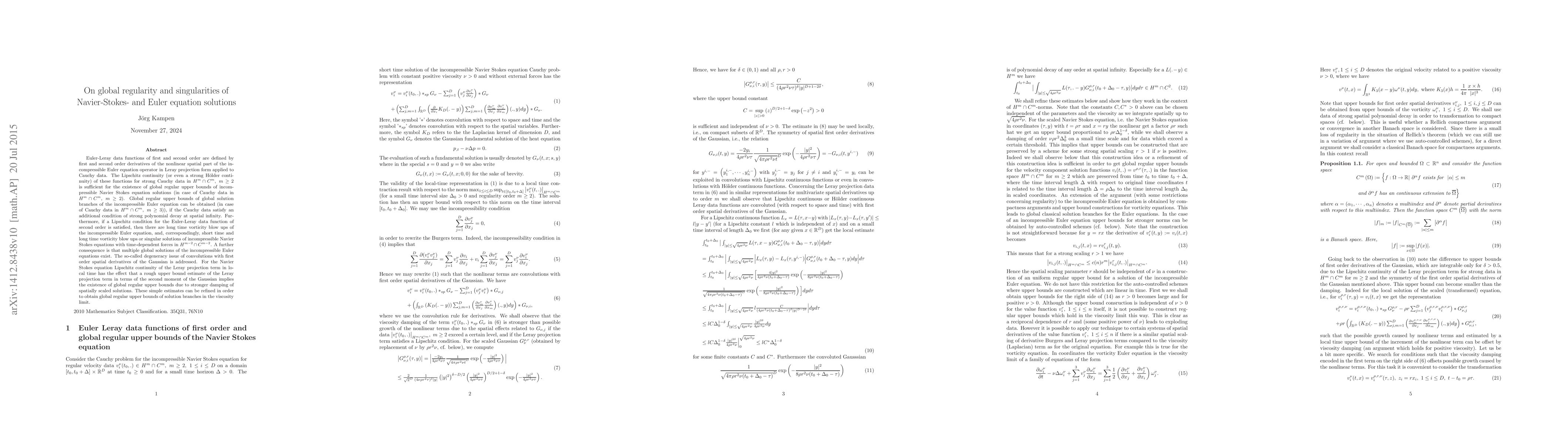 Euler-Leray data functions of first and second order are defined by first and second order derivatives of the nonlinear spatial part of the incompressible Euler equation operator in Leray projection form applied to Cauchy data. The Lipschitz continuity of these functions for a certain class of strongly regular Cauchy data is sufficient for the existence of global regular upper bounds of incompressible Navier Stokes equation solutions. Global regular upper bounds of global solution branches of the incompressible Euler equation can be obtained for a class of strongly regular Cauchy data, if the Cauchy data satisfy an additional condition of strong polynomial decay at spatial infinity. Furthermore, if a Lipschitz condition for the Euler- Leray data function of second order is satisfied, then there are long time vorticity blow ups of the incompressible Euler equation, and, correspondingly, short time and long time vorticity blow ups or singular solutions of incompressible Navier Stokes equations with time-dependent forces of lower regularity. A further consequence is that multiple global solutions of the incompressible Euler equations exists.