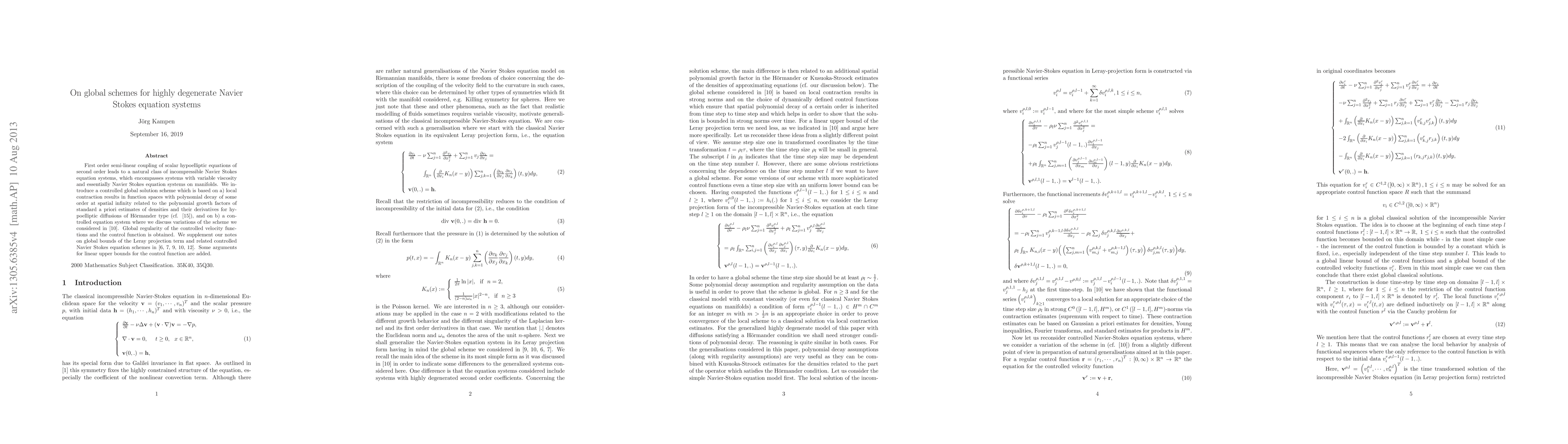 This paper introduces a controlled global solution scheme for highly degenerate incompressible Navier-Stokes equation systems, leveraging local contraction results in function spaces and extending previous schemes to encompass variable viscosity and manifold-based systems. The authors also provide additional insights on global bounds of the Leray projection term and linear upper bounds of the control function.