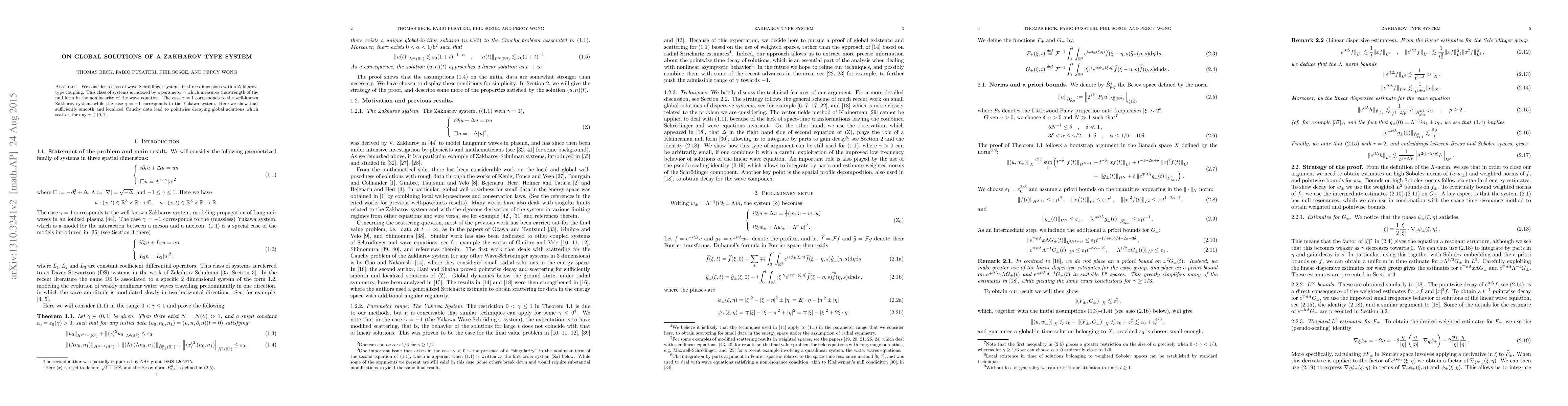 We consider a class of wave-Schroedinger systems with a Zakharov-Schulman type coupling. This class of systems is indexed by a parameter gamma which measures the strength of the null form in the nonlinearity of the wave equation. The case gamma = 1 corresponds to the well-known Zakharov system, while the case gamma = -1 corresponds to the Yukawa system. Here we show that sufficiently smooth and localized Cauchy data lead to pointwise decaying global solutions which scatter, for any gamma in (0,1].