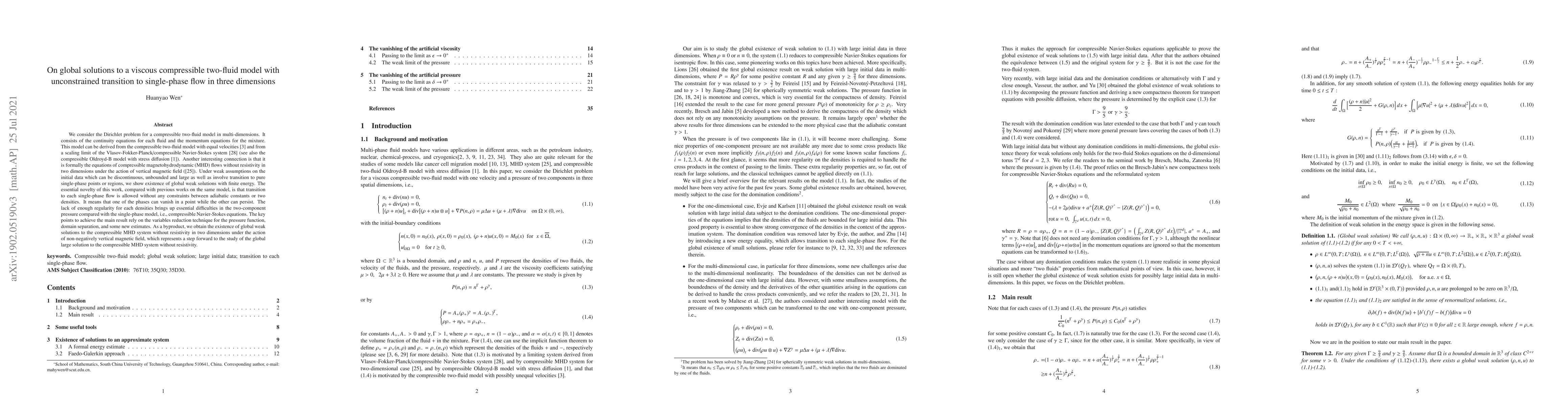 We consider the Dirichlet problem for a compressible two-fluid model in three dimensions, and obtain the global existence of weak solution with large initial data and independent adiabatic constants \Gamma,\gamma>=9/5. The pressure functions are of two components solving the continuity equations. Two typical cases for the pressure are considered, which are motivated by the compressible two-fluid model with possibly unequal velocities [3] and by a limiting system from the Vlasov-Fokker-Planck/compressible Navier-Stokes system [27] (see also some other relevant models like compressible MHD system for two-dimensional case [24] and compressible Oldroyd-B model with stress diffusion [1]). The lack of enough regularity for the two densities turns out some essential difficulties in the two-component pressure compared with the single-phase model, i.e., compressible Navier-Stokes equations. In this paper, the global existence theory does not require any domination conditions for the initial densities, which implies that transition to each single-phase flow is allowed.