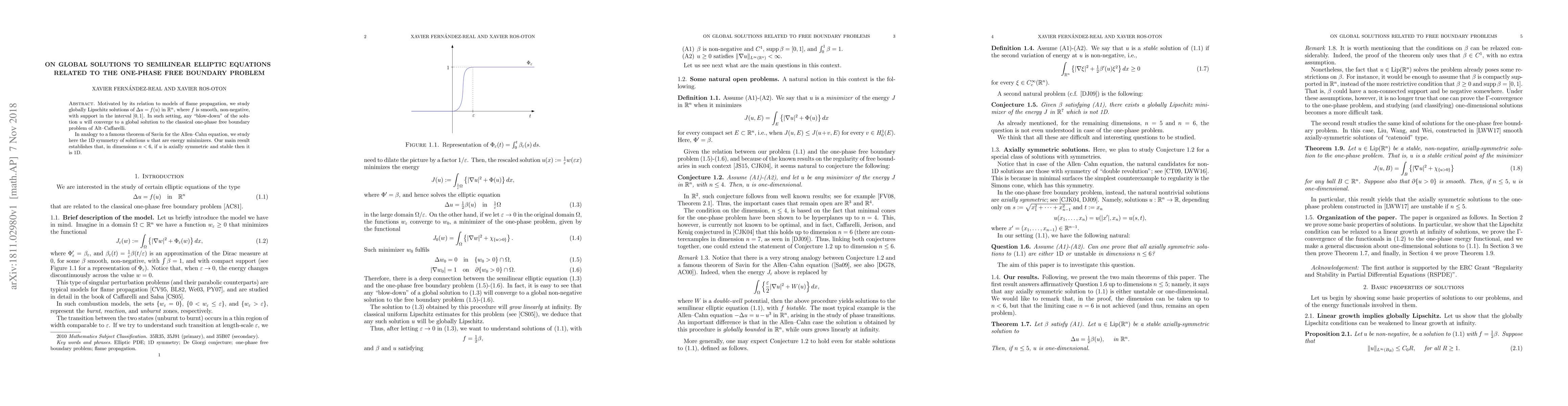 This paper studies global solutions to semilinear elliptic equations related to flame propagation models, finding that axially symmetric stable solutions in dimensions n<6 are 1D.