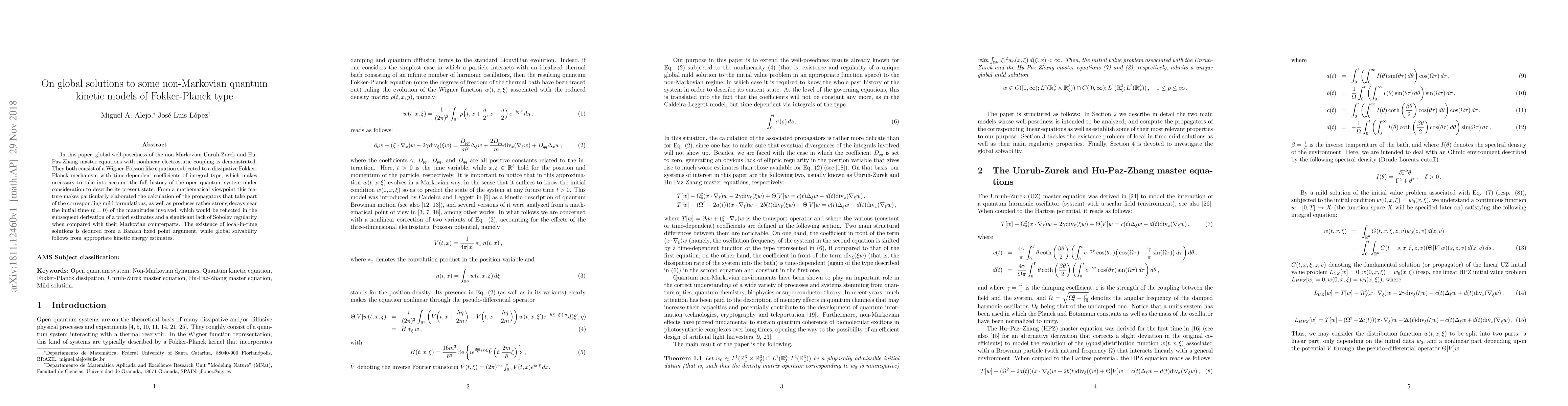 In this paper, global well-posedness of the non-Markovian Unruh-Zurek and Hu-Paz-Zhang master equations with nonlinear electrostatic coupling is demonstrated. They both consist of a Wigner-Poisson like equation subjected to a dissipative Fokker-Planck mechanism with time-dependent coefficients of integral type, which makes necessary to take into account the full history of the open quantum system under consideration to describe its present state. From a mathematical viewpoint this feature makes particularly elaborated the calculation of the propagators that take part of the corresponding mild formulations, as well as produces rather strong decays near the initial time ($t=0$) of the magnitudes involved, which would be reflected in the subsequent derivation of a priori estimates and a significant lack of Sobolev regularity when compared with their Markovian counterparts. The existence of local-in-time solutions is deduced from a Banach fixed point argument, while global solvability follows from appropriate kinetic energy estimates.