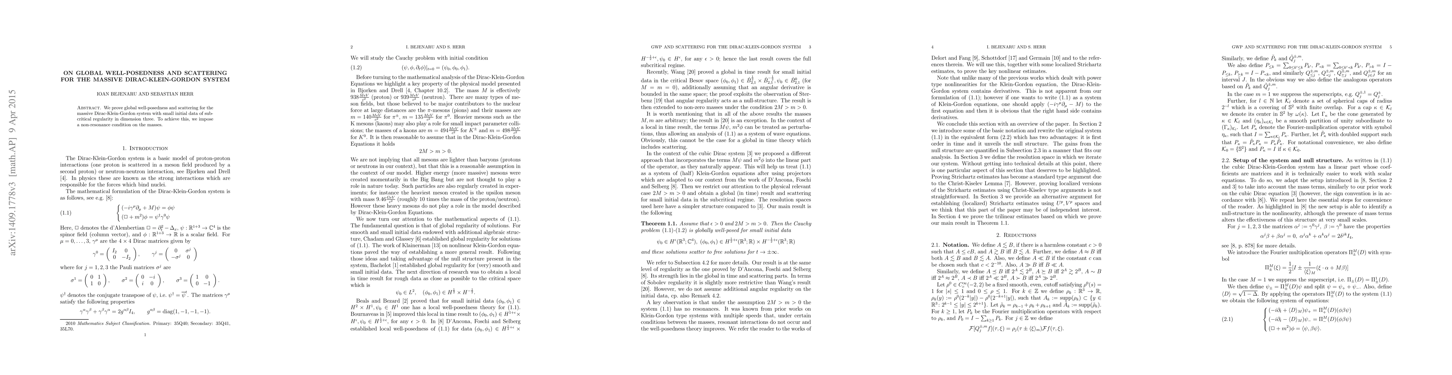 Summary: This paper establishes global well-posedness and scattering for the massive Dirac-Klein-Gordon system under small initial data conditions, demonstrating effectiveness in three dimensions, provided a non-resonance condition on the system's masses is satisfied.