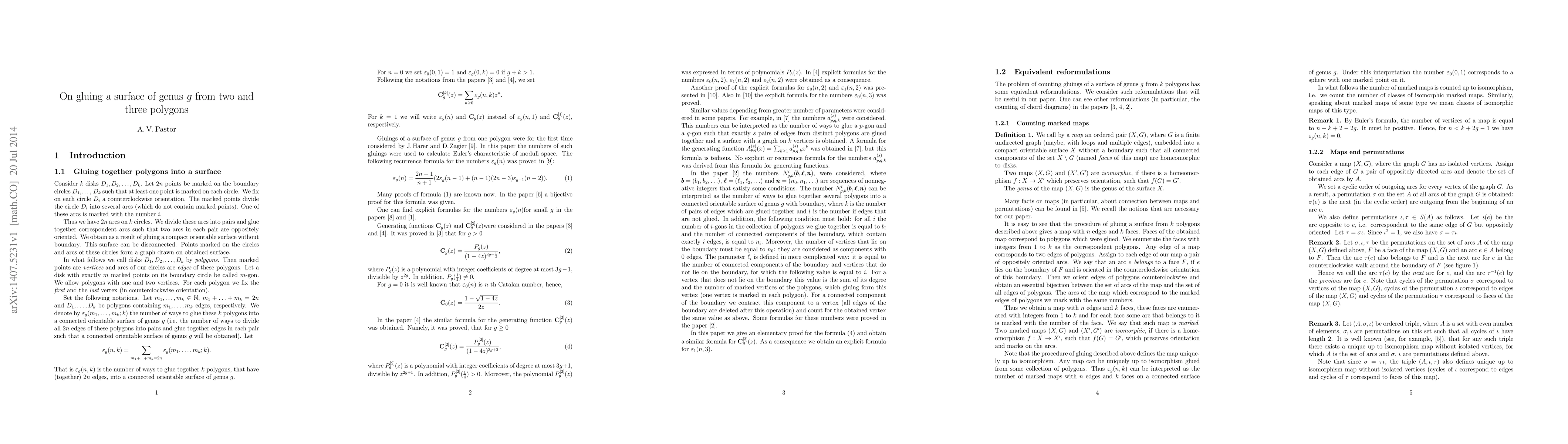 In this paper the number of ways to glue together several polygons into a surface of genus $g$ has been investigated. We've given an elementary proof on the formula for the generating function $\mathbf{C}_g^{[2]}(z)$ of the number of gluings surface of genus $g$ from two polygons (see also [4]). Moreover, we've proven a similar formula for gluings surface of genus $g$ from three polygons. As a corollary, we've proven a direct formula for the number of gluings torus from three polygons.