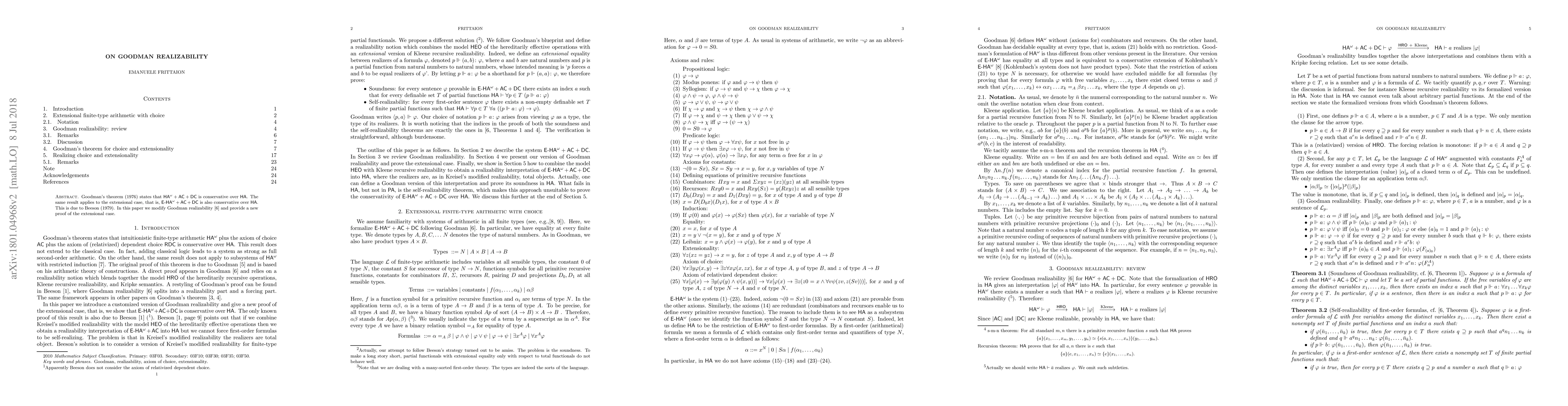 Goodman's theorem (1976) states that intuitionistic finite-type arithmetic plus the axiom of choice plus the axiom of relativized dependent choice is conservative over Heyting arithmetic. The same result applies to the extensional variant. This is due to Beeson (1979). In this paper we modify Goodman realizability (1978) and provide a new proof of the extensional case.