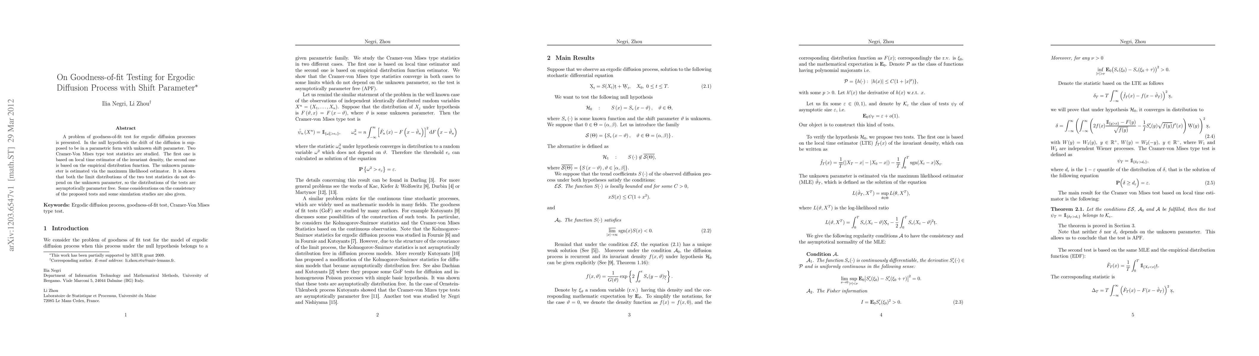 This paper proposes goodness-of-fit tests for ergodic diffusion processes with a shift parameter, using two Cramer-Von Mises type test statistics. Both test statistics are shown to have asymptotically parameter-free distributions, and the paper includes a discussion on their consistency and simulation results.