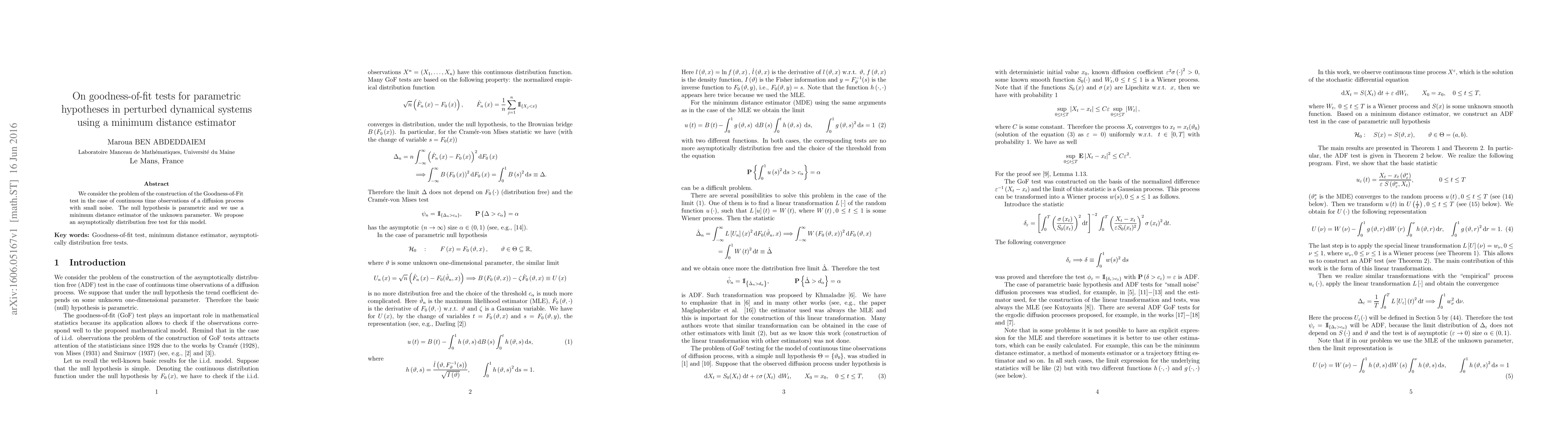 Researchers develop an asymptotically distribution-free Goodness-of-Fit test for analyzing diffusion processes with small noise, providing a solution to parametric hypothesis testing in perturbed dynamical systems.