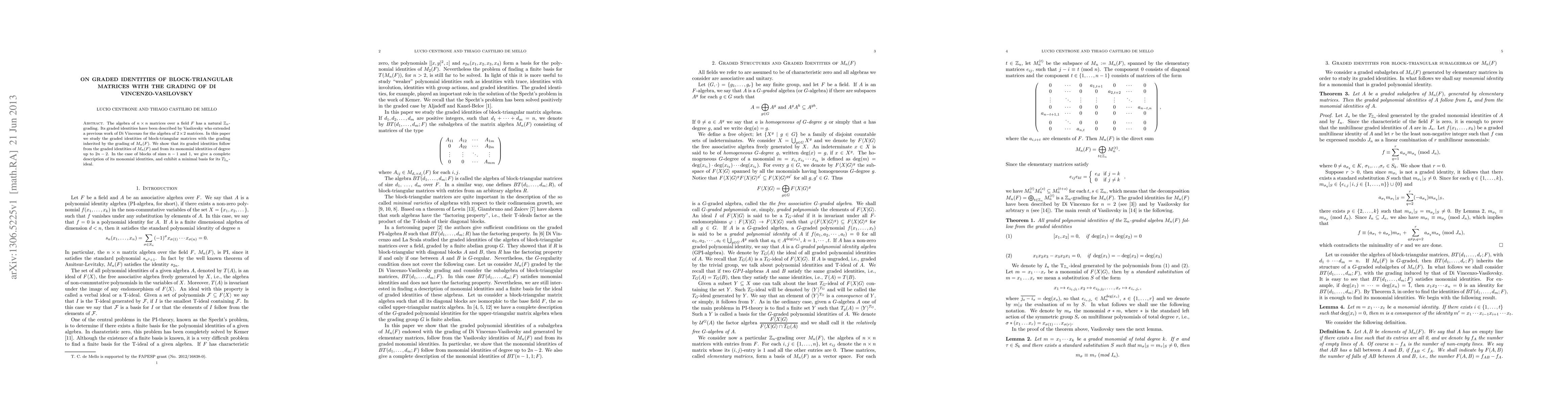 This paper explores the graded identities of block-triangular matrices with a $\mathbb{Z}_n$-grading derived from $M_n(F)$. It demonstrates that these graded identities are derived from those of $M_n(F)$ and specific monomial identities up to degree $2n-2$, and provides a complete description of monomial identities and a minimal basis for $T_{\mathbb{Z}_n}$-ideal for blocks of sizes $n-1$ and 1.