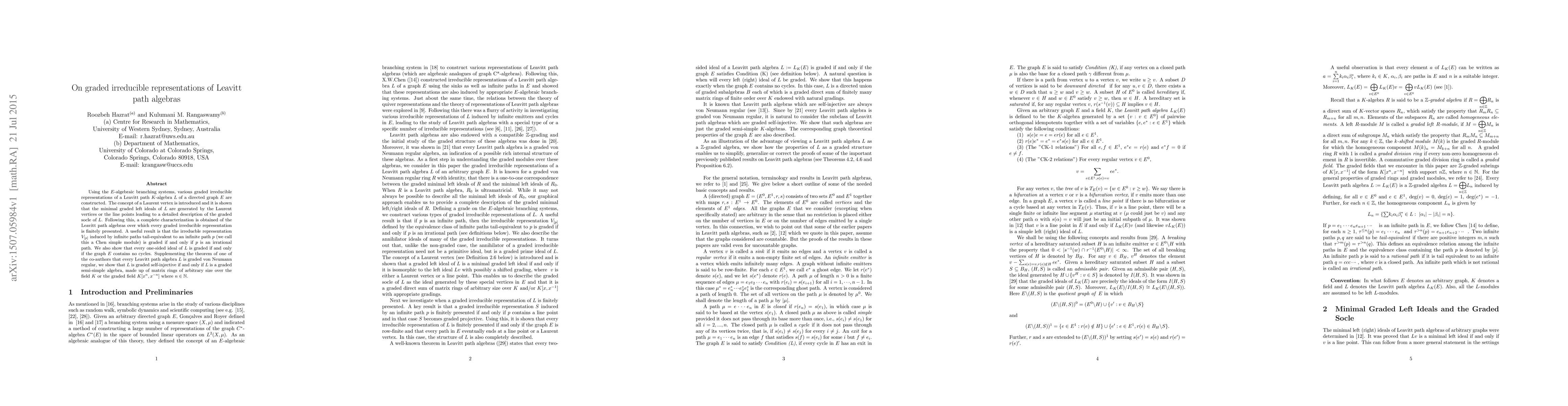 Using the E-algebraic systems, various graded irreducible representations of a Leavitt path algebra L of a graph E over a field K are constructed. The concept of a Laurent vertex is introduced and it is shown that the minimal graded left ideals of L are generated by Laurent vertices and/or line points leading to a detailed description of the graded socle of L. Following this, a complete characterization is obtained of the Leavitt path algebras over which every graded irreducible representation is finitely presented. A useful result is that the irreducible representation V_[p] induced by infinite path tail-equivalent to an infinite path p is graded if and only if p is an irrational infinite path. We also show that every one-sided ideal of L is graded if and only if the graph E contains no cycles. Supplementing a theorem of one of the co-authors that every Leavitt path algebra is graded von Neumann regular, we describe the graded self-injective Leavitt path algebras. These turn out to be direct sums of matrix rings of arbitrary size over K and k[x,x^-1].