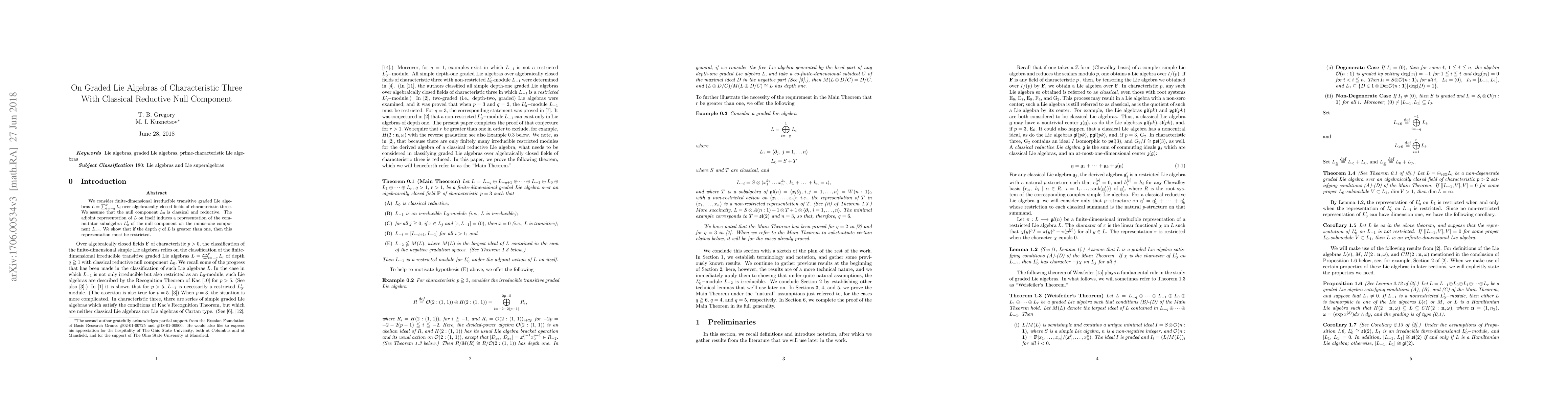 This paper studies finite-dimensional irreducible transitive graded Lie algebras over fields of characteristic three, focusing on those with a classical reductive null component. It demonstrates that if the depth of the algebra exceeds one, the representation of the null component's commutator subalgebra on the minus-one component must be restricted.