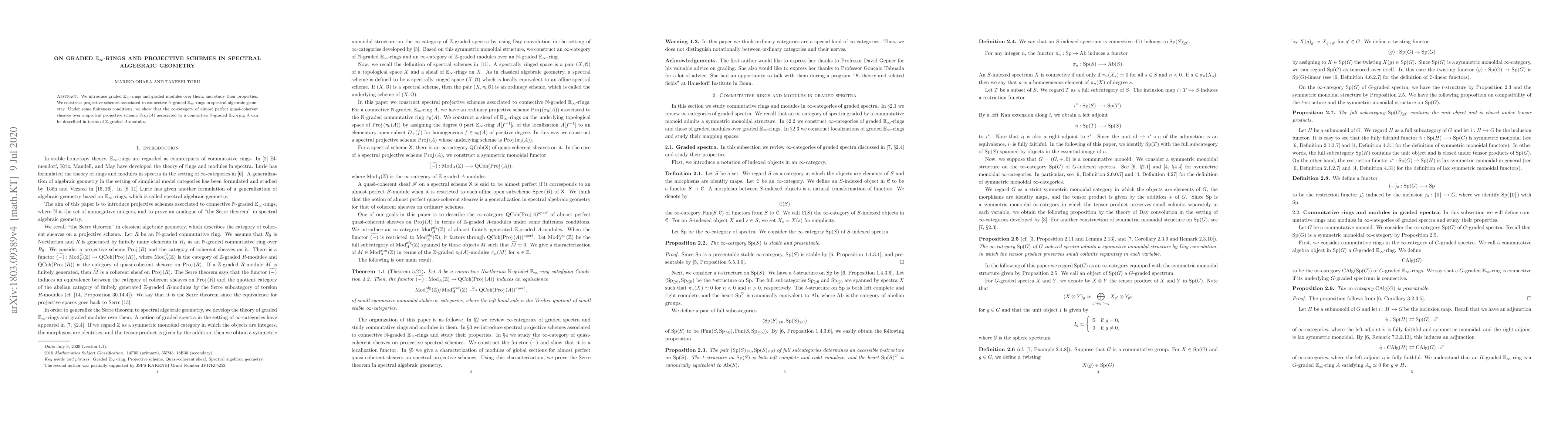 Summary: This paper explores graded $\mathbb{E}_{\infty}$-rings and their modules, constructs projective schemes in spectral algebraic geometry, and demonstrates that under finiteness conditions, the $\infty$-category of perfect quasi-coherent sheaves over these schemes corresponds to $\mathbb{Z}$-graded $A$-modules for a connective $\mathbb{N}$-graded $\mathbb{E}_{\infty}$-ring $A$.
