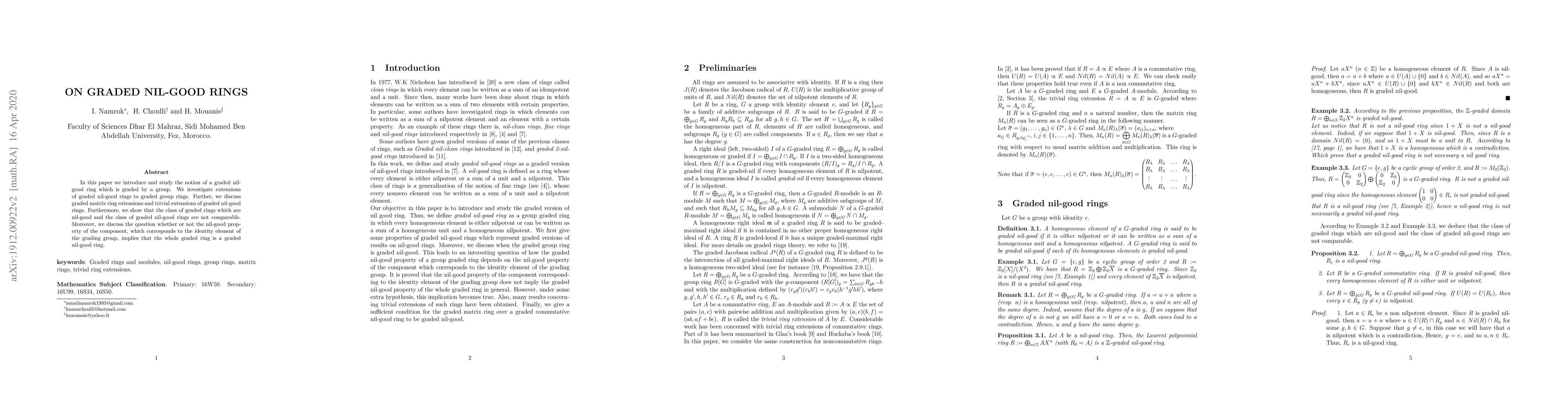 This paper introduces the concept of graded nil-good rings, examining their extensions to graded group rings and matrix ring extensions. It concludes that the nil-good property for components does not necessarily imply the property for the entire graded ring.