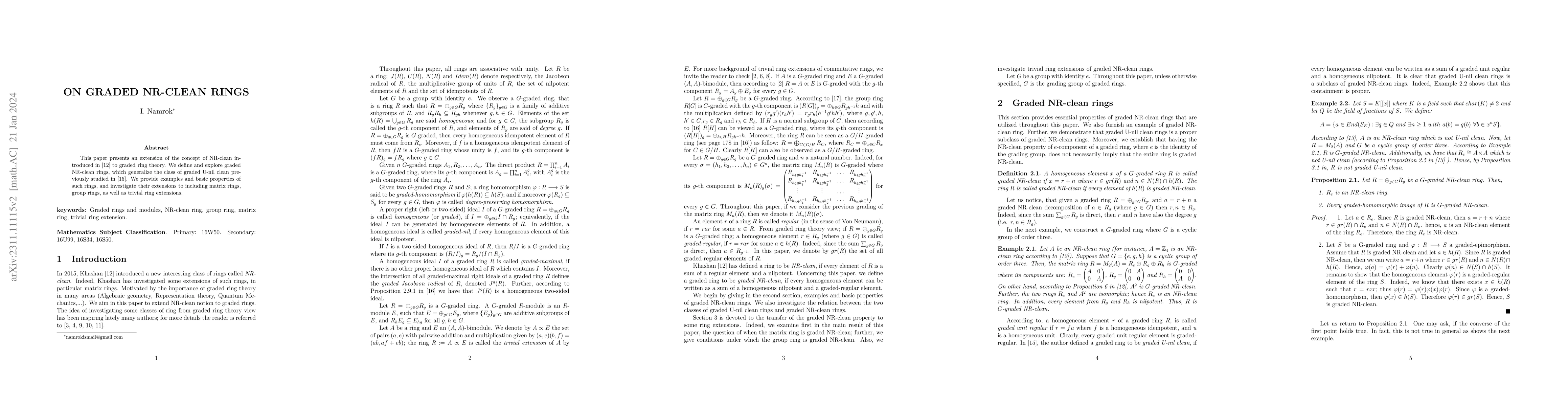 This paper extends the concept of NR-clean rings to graded ring theory, defining and exploring graded NR-clean rings. It provides examples and basic properties of these rings, along with their extensions to matrix rings, group rings, and trivial ring extensions.