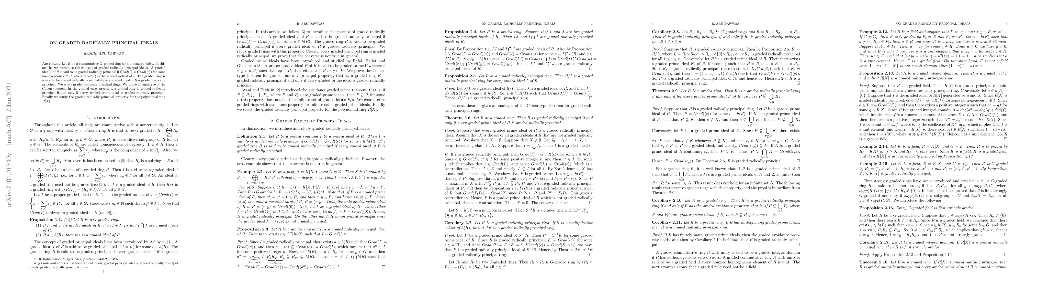This paper introduces the concept of graded radically principal ideals in commutative G-graded rings and studies their properties, including an analogue of the Cohen theorem and implications for polynomial rings.