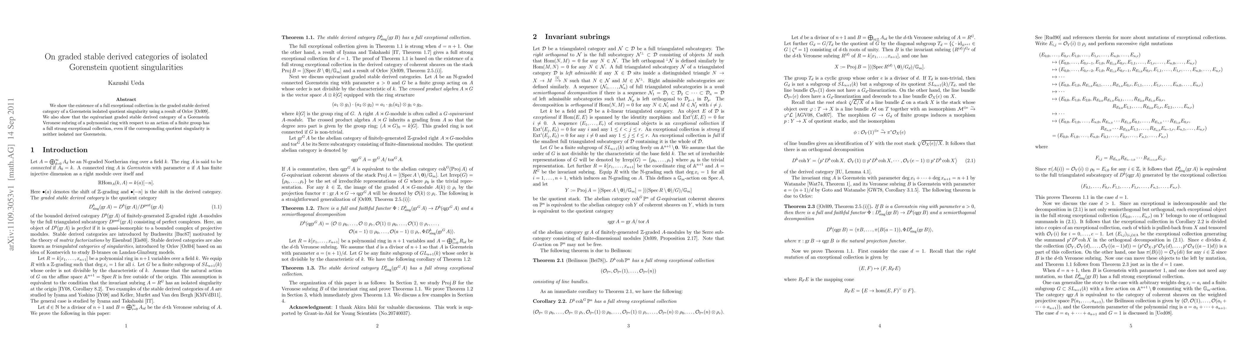 Summary: This paper establishes the presence of a full exceptional collection in the graded stable derived category of Gorenstein isolated quotient singularities, leveraging Orlov's result. Additionally, it demonstrates a full strong exceptional collection in the equivariant graded stable derived category of Gorenstein Veronese subrings, despite the absence of isolated or Gorenstein conditions in the quotient singularity.