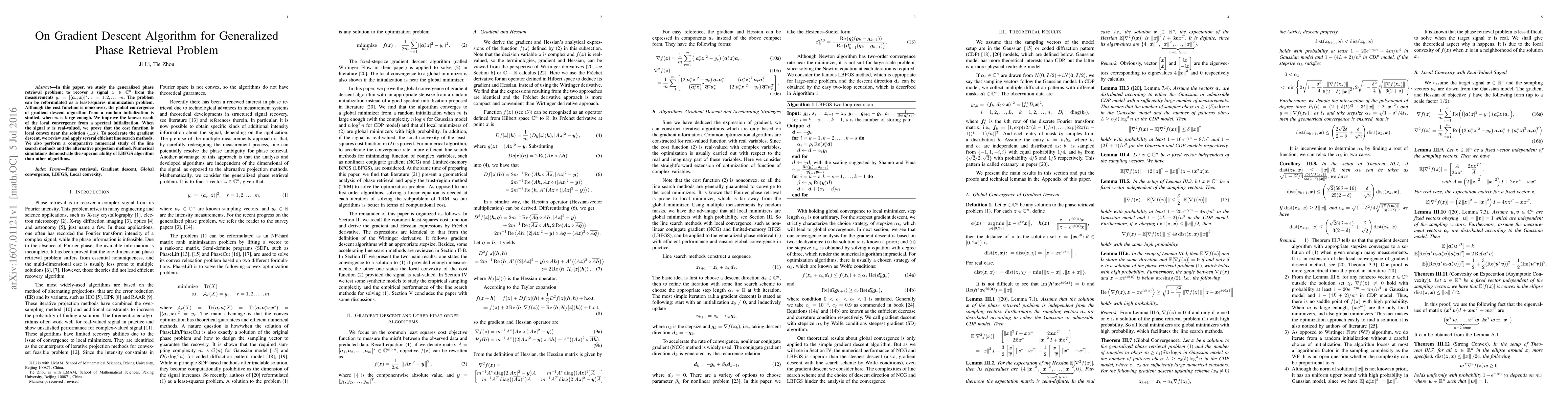 This paper investigates the generalized phase retrieval problem using gradient descent, proving its global convergence under large measurement conditions. It also demonstrates local convexity for real-valued signals and compares various line search methods, showing that the LBFGS algorithm outperforms others in numerical simulations.