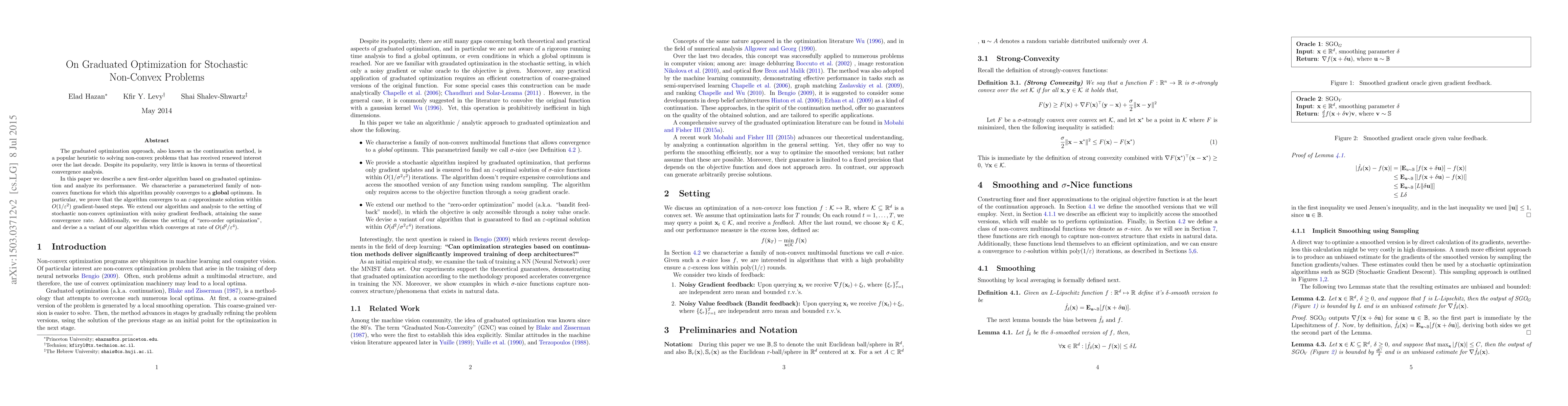 The graduated optimization approach, also known as the continuation method, is a popular heuristic to solving non-convex problems that has received renewed interest over the last decade. Despite its popularity, very little is known in terms of theoretical convergence analysis. In this paper we describe a new first-order algorithm based on graduated optimiza- tion and analyze its performance. We characterize a parameterized family of non- convex functions for which this algorithm provably converges to a global optimum. In particular, we prove that the algorithm converges to an {\epsilon}-approximate solution within O(1/\epsilon^2) gradient-based steps. We extend our algorithm and analysis to the setting of stochastic non-convex optimization with noisy gradient feedback, attaining the same convergence rate. Additionally, we discuss the setting of zero-order optimization, and devise a a variant of our algorithm which converges at rate of O(d^2/\epsilon^4).