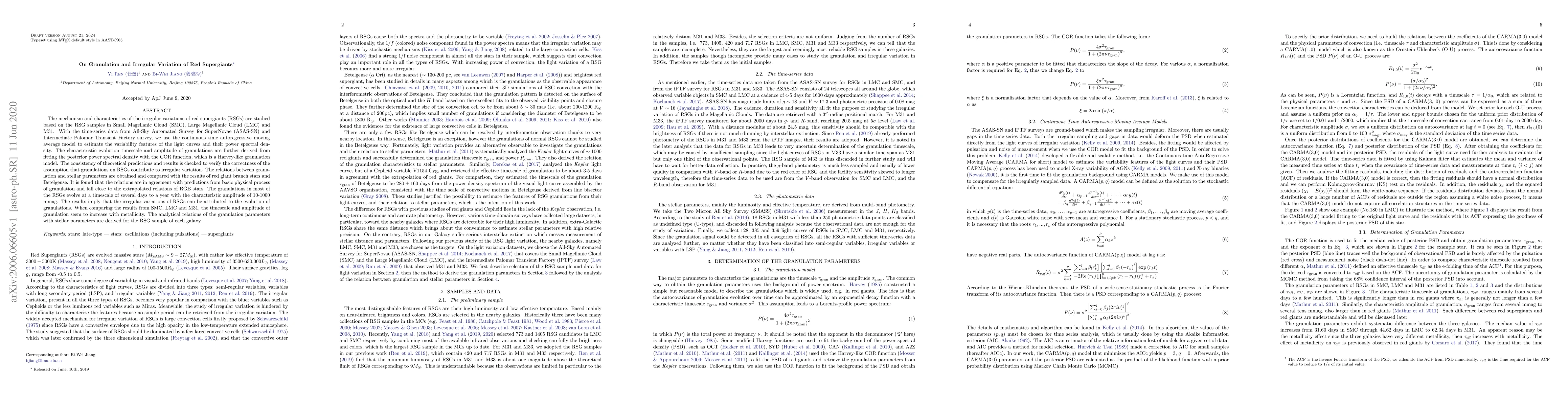 This paper investigates the irregular variations of red supergiants (RSGs) using time-series data from ASAS-SN and IPT, employing a continuous time autoregressive model to analyze light curves. The study concludes that granulations contribute to these variations, with most RSGs showing granulations evolving over days to a year and amplitudes of 10-1000 mmag, with trends suggesting an increase in granulation timescale and amplitude with higher metallicity.