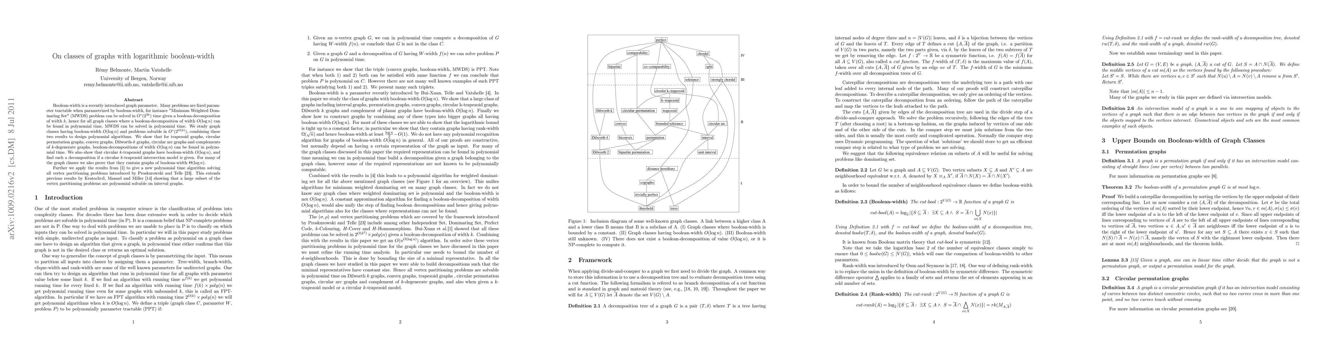Boolean-width is a recently introduced graph parameter. Many problems are fixed parameter tractable when parametrized by boolean-width, for instance "Minimum Weighted Dominating Set" (MWDS) problem can be solved in $O^*(2^{3k})$ time given a boolean-decomposition of width $k$, hence for all graph classes where a boolean-decomposition of width $O(\log n)$ can be found in polynomial time, MWDS can be solved in polynomial time. We study graph classes having boolean-width $O(\log n)$ and problems solvable in $O^*(2^{O(k)})$, combining these two results to design polynomial algorithms. We show that for trapezoid graphs, circular permutation graphs, convex graphs, Dilworth-$k$ graphs, circular arc graphs and complements of $k$-degenerate graphs, boolean-decompositions of width $O(\log n)$ can be found in polynomial time. We also show that circular $k$-trapezoid graphs have boolean-width $O(\log n)$, and find such a decomposition if a circular $k$-trapezoid intersection model is given. For many of the graph classes we also prove that they contain graphs of boolean-width $\Theta(\log n)$. Further we apply the results from \cite{boolw2} to give a new polynomial time algorithm solving all vertex partitioning problems introduced by Proskurowski and Telle \cite{TP97}. This extends previous results by Kratochv\'il, Manuel and Miller \cite{KMM95} showing that a large subset of the vertex partitioning problems are polynomial solvable on interval graphs.