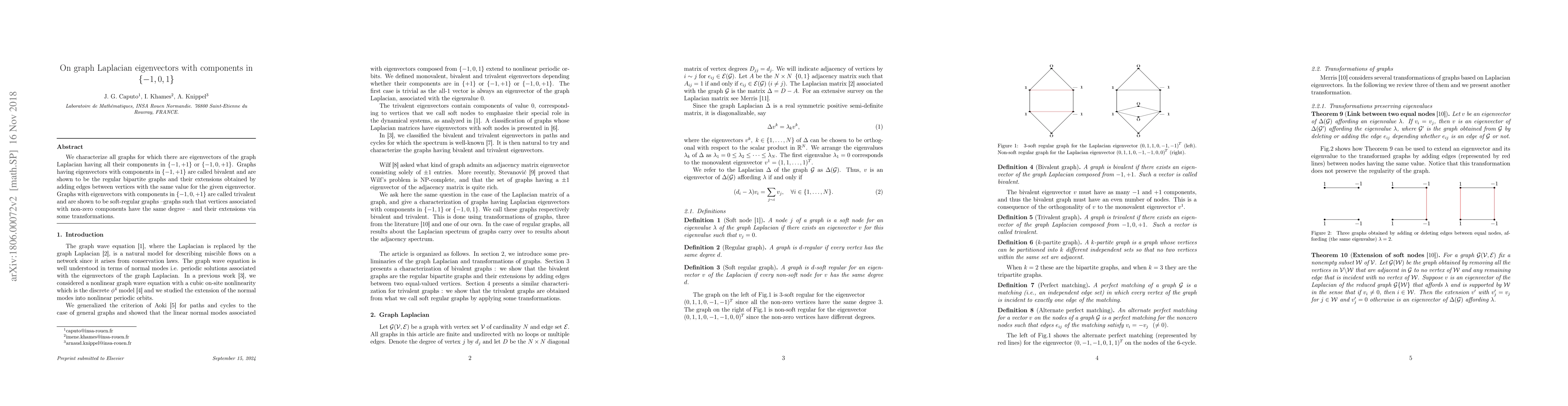 This paper characterizes regular bipartite graphs and their extensions as bivalent graphs with Laplacian eigenvectors in {-1, +1}, and soft-regular graphs as trivalent graphs with eigenvectors in {-1, 0, +1}, along with their respective extensions via transformations.