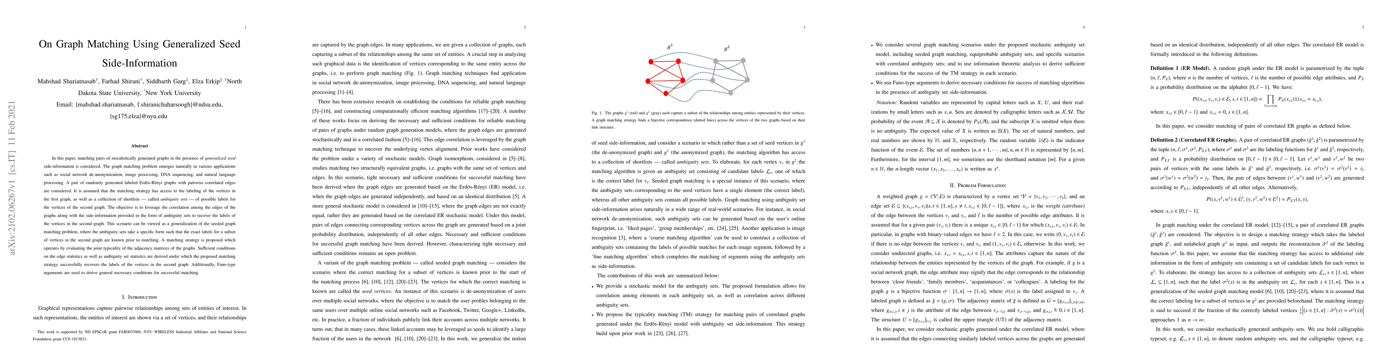 In this paper, matching pairs of stocahstically generated graphs in the presence of generalized seed side-information is considered. The graph matching problem emerges naturally in various applications such as social network de-anonymization, image processing, DNA sequencing, and natural language processing. A pair of randomly generated labeled Erdos-Renyi graphs with pairwise correlated edges are considered. It is assumed that the matching strategy has access to the labeling of the vertices in the first graph, as well as a collection of shortlists -- called ambiguity sets -- of possible labels for the vertices of the second graph. The objective is to leverage the correlation among the edges of the graphs along with the side-information provided in the form of ambiguity sets to recover the labels of the vertices in the second graph. This scenario can be viewed as a generalization of the seeded graph matching problem, where the ambiguity sets take a specific form such that the exact labels for a subset of vertices in the second graph are known prior to matching. A matching strategy is proposed which operates by evaluating the joint typicality of the adjacency matrices of the graphs. Sufficient conditions on the edge statistics as well as ambiguity set statistics are derived under which the proposed matching strategy successfully recovers the labels of the vertices in the second graph. Additionally, Fano-type arguments are used to derive general necessary conditions for successful matching.
