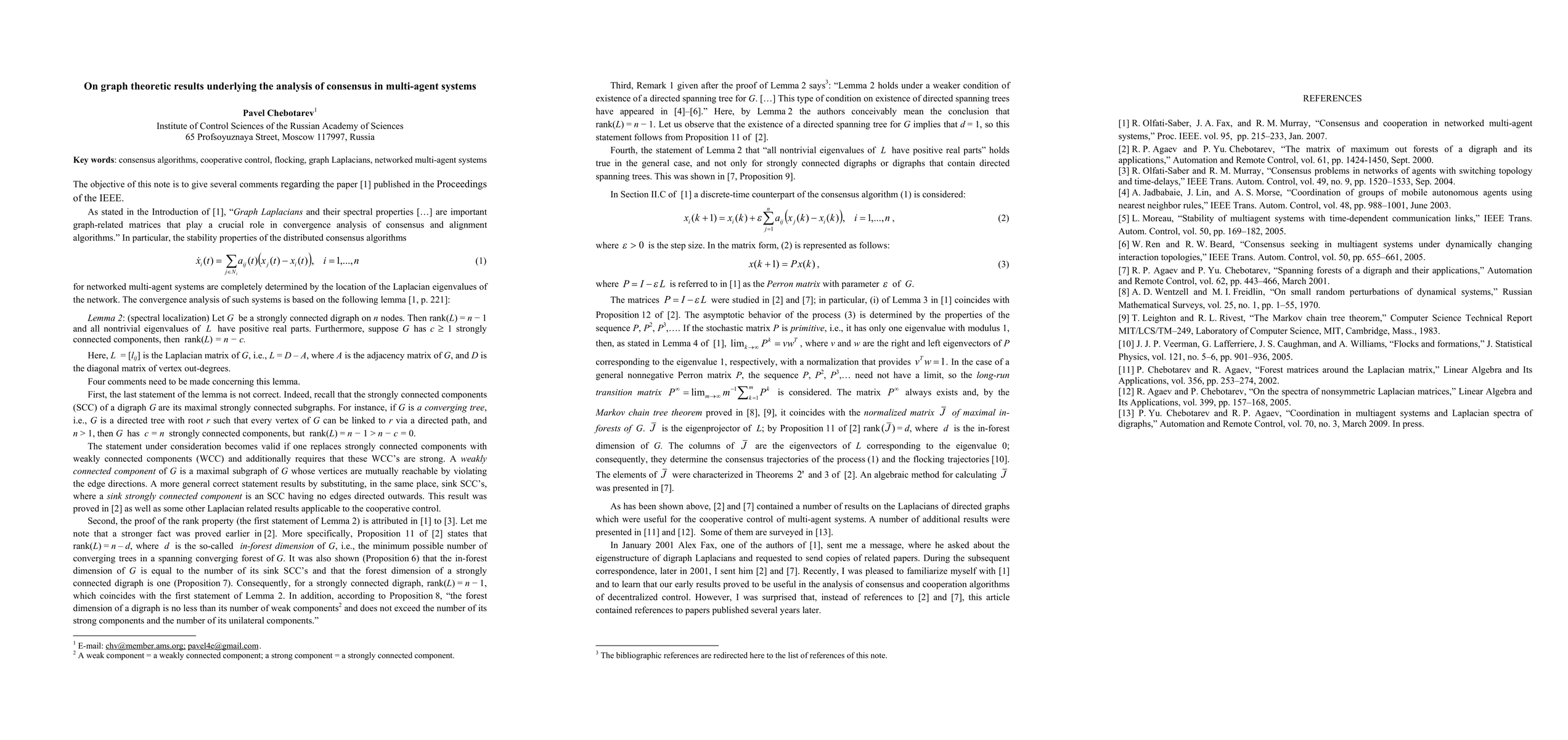 This note corrects a pretty serious mistake and some inaccuracies in "Consensus and cooperation in networked multi-agent systems" by R. Olfati-Saber, J.A. Fax, and R.M. Murray, published in Vol. 95 of the Proceedings of the IEEE (2007, No. 1, P. 215-233). It also mentions several stronger results applicable to the class of problems under consideration and addresses the issue of priority whose interpretation in the above-mentioned paper is not exact.