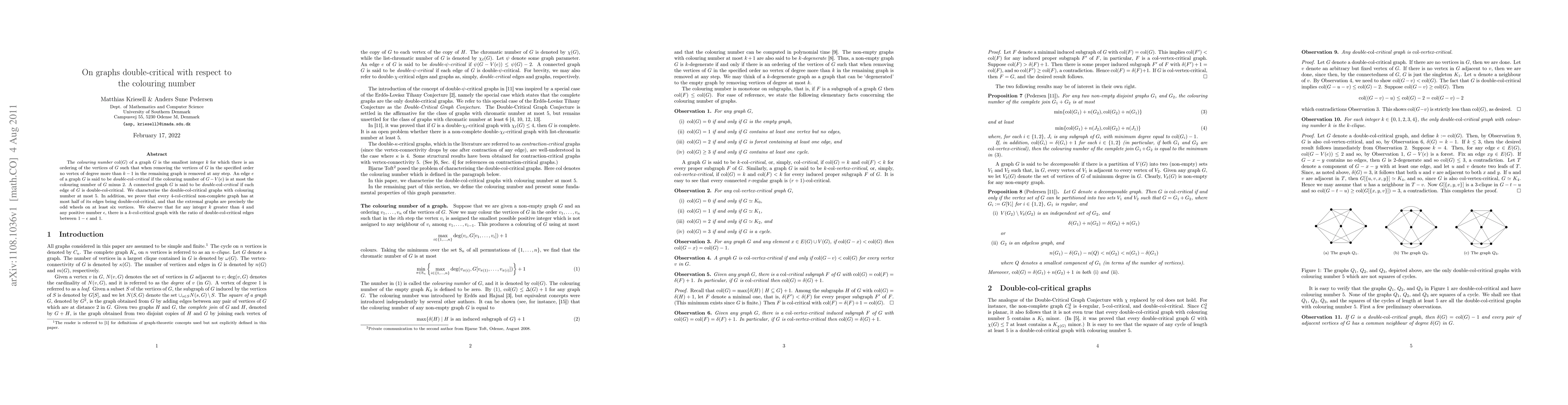The colouring number col(G) of a graph G is the smallest integer k for which there is an ordering of the vertices of G such that when removing the vertices of G in the specified order no vertex of degree more than k-1 in the remaining graph is removed at any step. An edge e of a graph G is said to be double-col-critical if the colouring number of G-V(e) is at most the colouring number of G minus 2. A connected graph G is said to be double-col-critical if each edge of G is double-col-critical. We characterise the double-col-critical graphs with colouring number at most 5. In addition, we prove that every 4-col-critical non-complete graph has at most half of its edges being double-col-critical, and that the extremal graphs are precisely the odd wheels on at least six vertices. We observe that for any integer k greater than 4 and any positive number r, there is a k-col-critical graph with the ratio of double-col-critical edges between 1- r and 1.