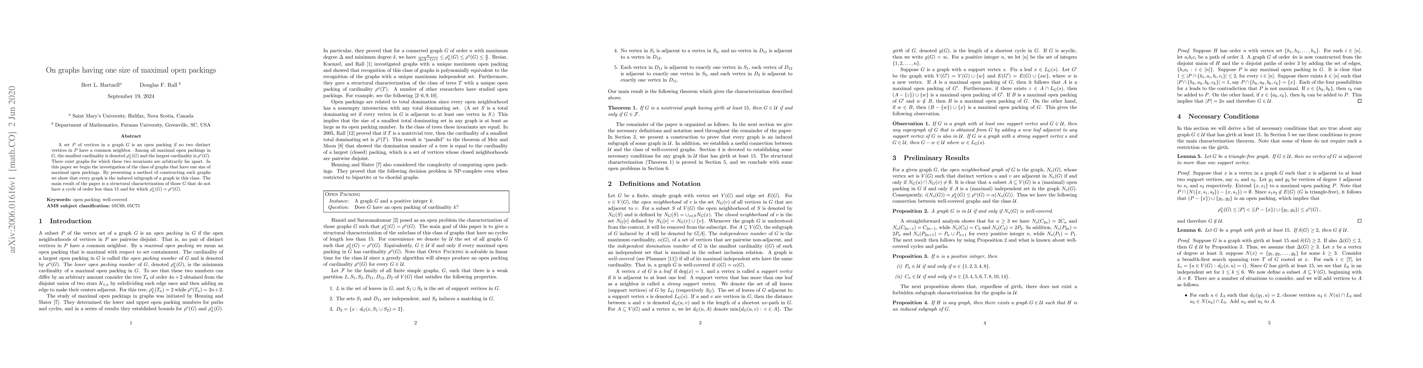 Researchers investigate graphs with a single size of maximal open packings, showing that every graph can be induced from such a graph and characterizing those without cycles under 15 with equal largest and smallest cardinality.