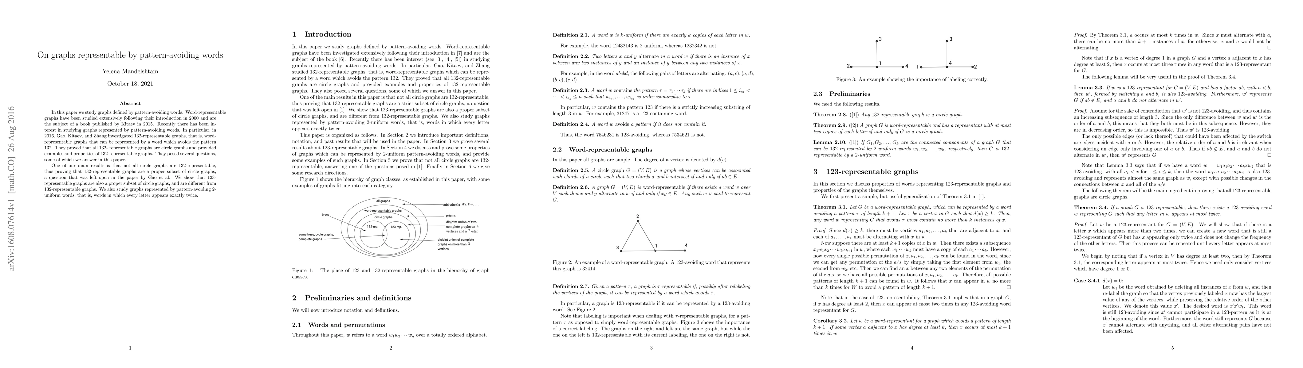 This paper investigates graphs represented by pattern-avoiding words, particularly focusing on 132-representable and 123-representable graphs. It proves that 132-representable graphs form a proper subset of circle graphs and identifies that 123-representable graphs are distinct from 132-representable graphs.