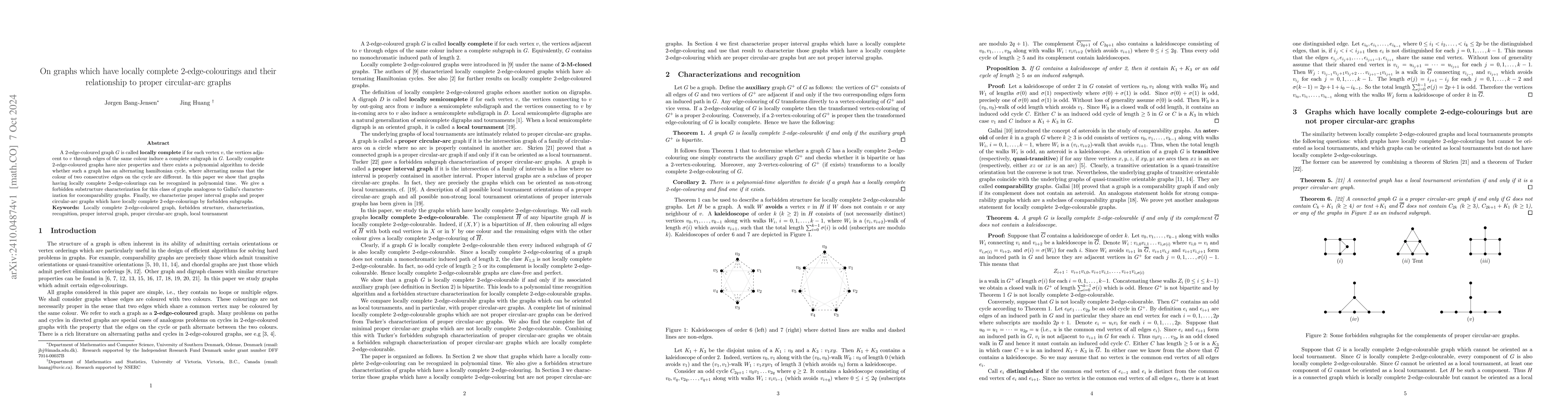 This paper investigates locally complete 2-edge-coloured graphs, demonstrating their recognition in polynomial time and presenting a forbidden substructure characterization. It also characterizes proper interval graphs and proper circular-arc graphs with locally complete 2-edge-colourings using forbidden subgraphs.