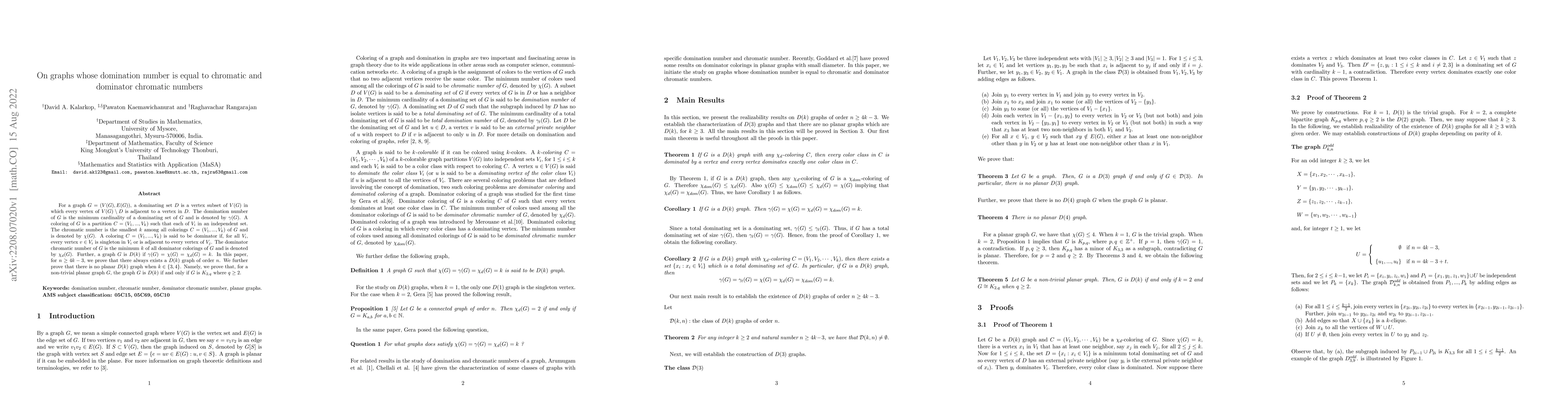 This paper investigates graphs where the domination number equals the chromatic number and the dominator chromatic number, denoted as $D(k)$ graphs. It proves the existence of $D(k)$ graphs of order $n \geq 4k - 3$ and shows that no planar $D(k)$ graph exists for $k \in \{3, 4\}$, except for specific bipartite graphs $K_{2, q}$.