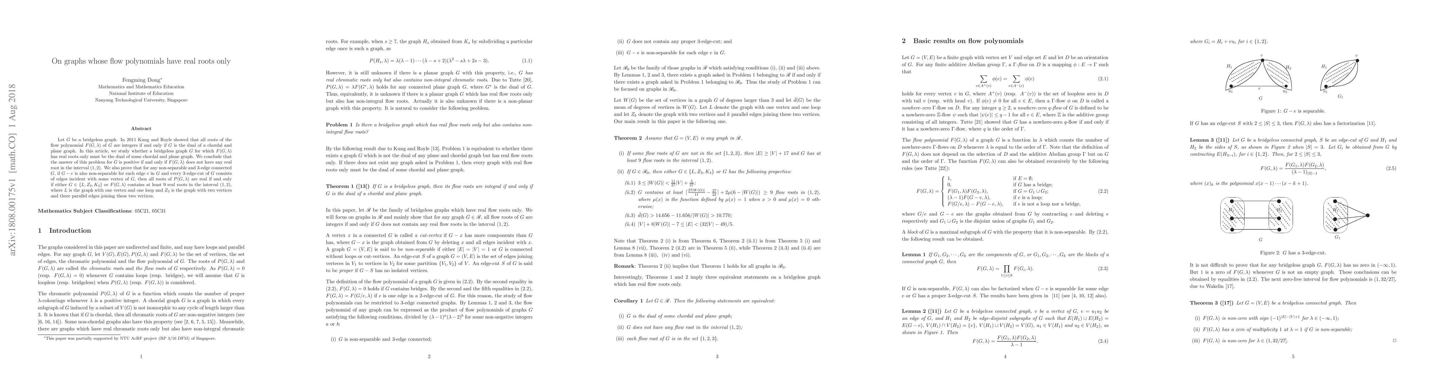 This paper investigates bridgeless graphs whose flow polynomial $F(G,\lambda)$ has only real roots, concluding that such graphs are duals of chordal and plane graphs if they lack real roots in $(1,2)$. It also specifies conditions for non-separable, $3$-edge-connected graphs ensuring real roots in their flow polynomial.