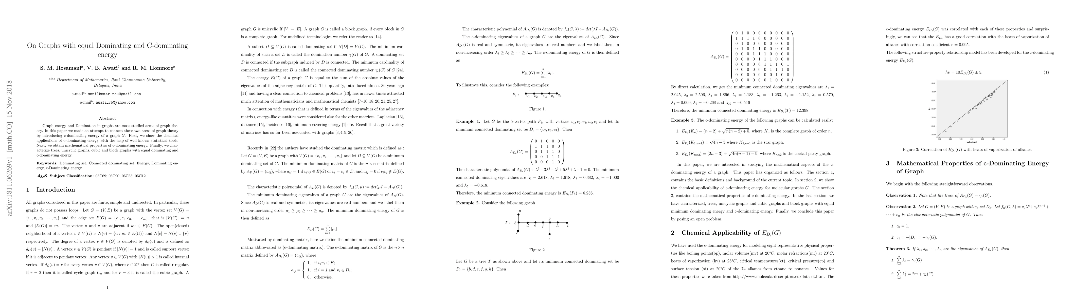 Researchers connected graph energy and domination in graph theory by introducing c-dominating energy, showing its applications and mathematical properties, and characterizing specific types of graphs with equal dominating and c-dominating energy.