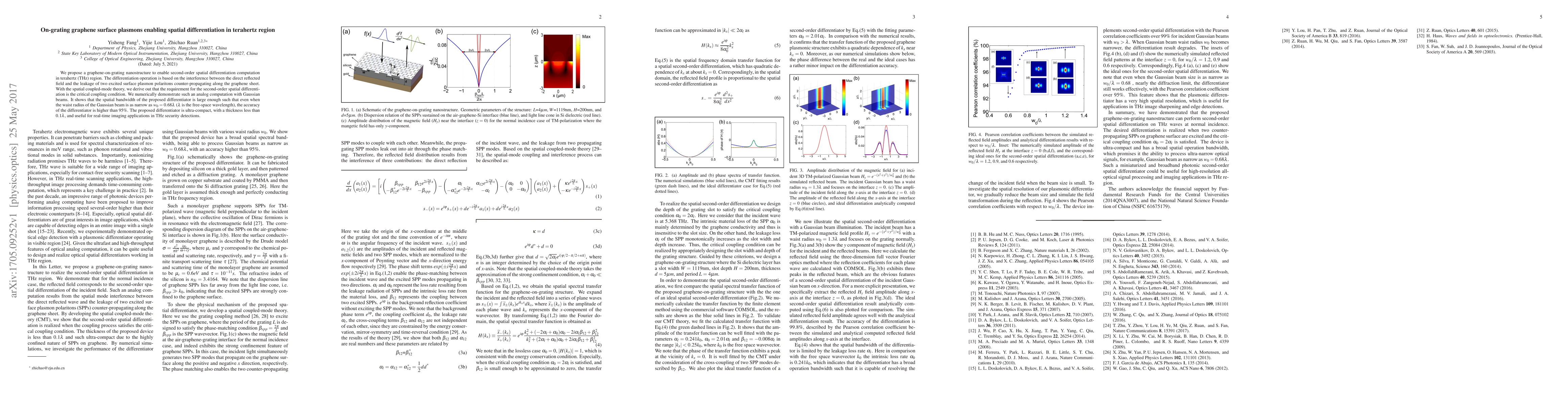 We propose a graphene-on-grating nanostructure to enable second-order spatial differentiation computation in terahertz (THz) region. The differentiation operation is based on the interference between the direct reflected field and the leakage of two excited surface plasmon polaritons counter-propagating along the graphene sheet. With the spatial coupled-mode theory, we derive out that the requirement for the second-order spatial differentiation is the critical coupling condition. We numerically demonstrate such an analog computation with Gaussian beams. It shows that the spatial bandwidth of the proposed differentiator is large enough such that even when the waist radius of the Gaussian beam is as narrow as ${{w}_{0}}=0.68\lambda $ ($\lambda $ is the free-space wavelength), the accuracy of the differentiator is higher than 95\%. The proposed differentiator is ultra-compact, with a thickness less than $0.1\lambda $, and useful for real-time imaging applications in THz security detections.