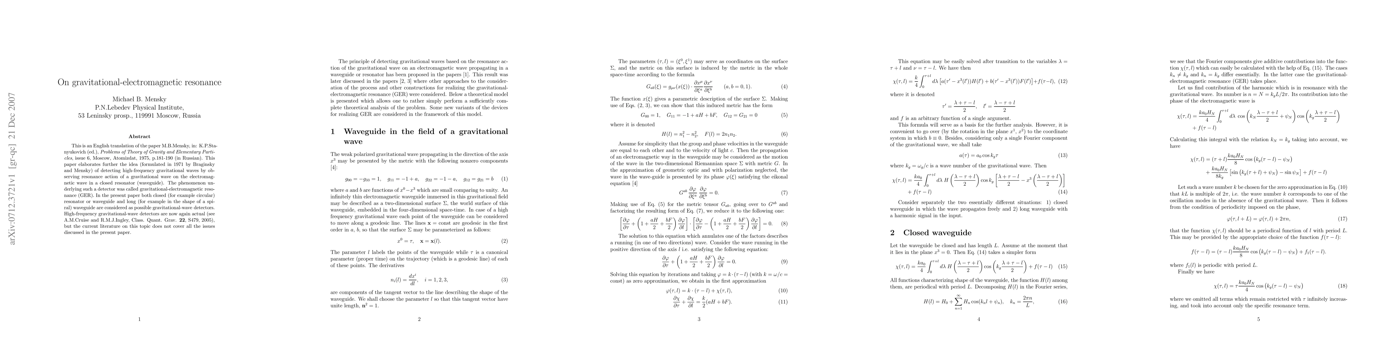 This is an English translation of the paper M.B.Mensky, in: K.P.Stanyukovich (ed.), "Problems of Theory of Gravity and Elementary Particles", issue 6, Moscow, Atomizdat, 1975, p.181-190 (in Russian). This paper elaborates further the idea (formulated in 1971 by Braginsky and Mensky) of detecting high-frequency gravitational waves by observing resonance action of a gravitational wave on the electromagnetic wave in a closed resonator (waveguide). The phenomenon underlying such a detector was called gravitational-electromagnetic resonance (GER). In the present paper both closed (for example circular) resonator or waveguide and long (for example in the shape of a spiral) waveguide are considered as possible gravitational-wave detectors. High-frequency gravitational-wave detectors are now again actual (see A.M.Cruise and R.M.J.Ingley, Class. Quant. Grav. 22, S479, 2005), but the current literature on this topic does not cover all the issues discussed in the present paper.