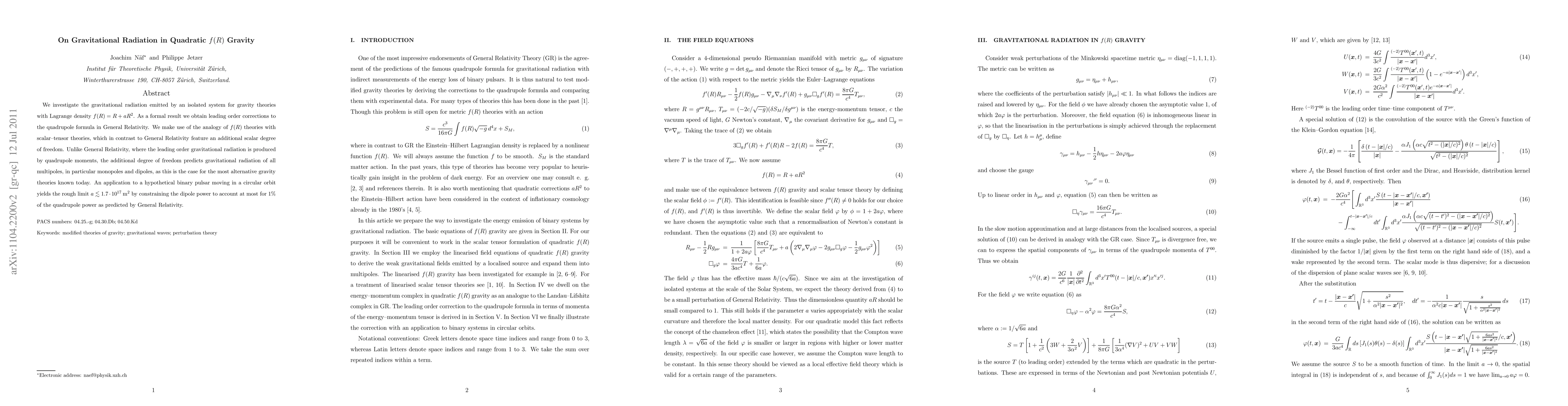 We investigate the gravitational radiation emitted by an isolated system for gravity theories with Lagrange density $f(R) = R + aR^2$. As a formal result we obtain leading order corrections to the quadrupole formula in General Relativity. We make use of the analogy of $f(R)$ theories with scalar--tensor theories, which in contrast to General Relativity feature an additional scalar degree of freedom. Unlike General Relativity, where the leading order gravitational radiation is produced by quadrupole moments, the additional degree of freedom predicts gravitational radiation of all multipoles, in particular monopoles and dipoles, as this is the case for the most alternative gravity theories known today. An application to a hypothetical binary pulsar moving in a circular orbit yields the rough limit $a \lesssim 1.7\cdot10^{17}\,\mathrm{m}^2$ by constraining the dipole power to account at most for 1% of the quadrupole power as predicted by General Relativity.