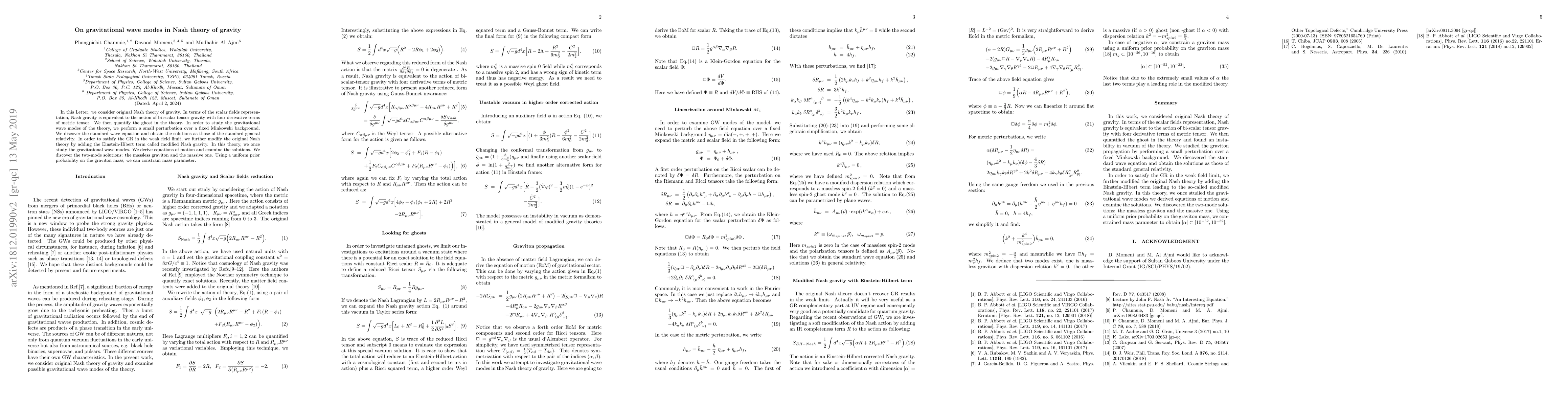 In this Letter, we consider original Nash theory of gravity. In terms of the scalar fields representation, Nash gravity is equivalent to the action of bi-scalar tensor gravity with four derivative terms of metric tensor. We then quantify the ghost in the theory. In order to study the gravitational wave modes of the theory, we perform a small perturbation over a fixed Minkowski background. We discover the standard wave equation and obtain the solutions as those of the standard general relativity. In order to satisfy the GR in the weak field limit, we further modify the original Nash theory by adding the Einstein-Hibert term called modified Nash gravity. In this theory, we once study the gravitational wave modes. We derive equations of motion and examine the solutions. We discover the two-mode solutions: the massless graviton and the massive one. Using a uniform prior probability on the graviton mass, we can constrain mass parameter.