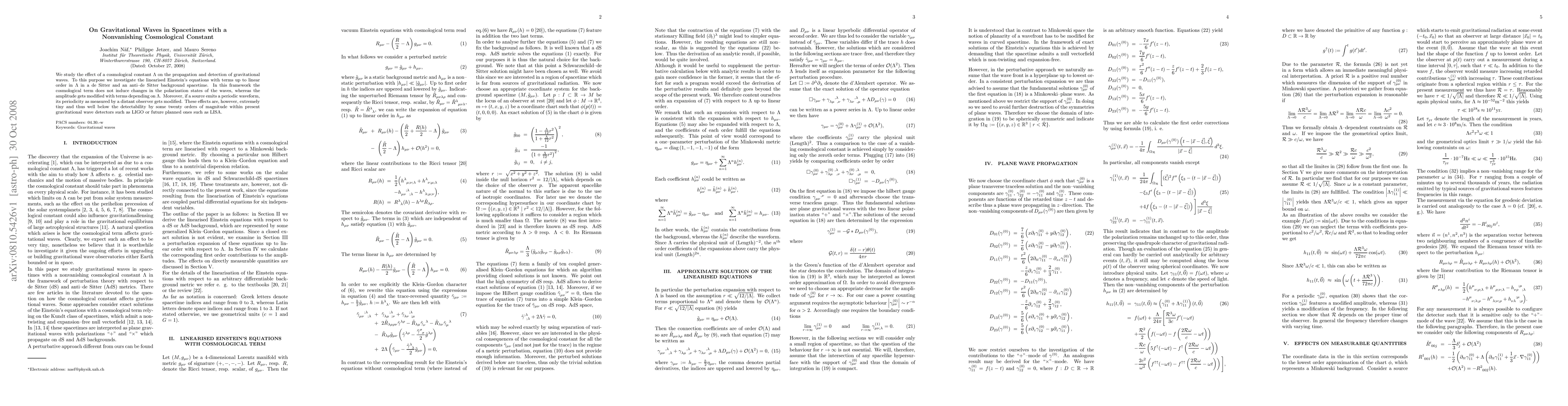 This paper examines how a nonvanishing cosmological constant affects the propagation and detection of gravitational waves, finding that while the amplitude and periodicity of waves are slightly modified, these changes are negligible for current and future gravitational wave detectors. The polarization states remain unaffected by the cosmological constant.