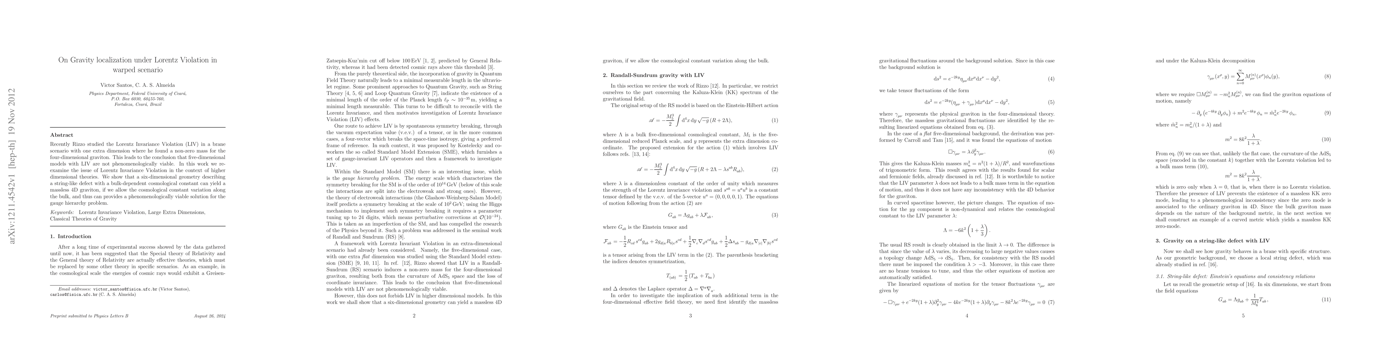 Recently Rizzo studied the Lorentz Invariance Violation (LIV) in a brane scenario with one extra dimension where he found a non-zero mass for the four-dimensional graviton. This leads to the conclusion that five-dimensional models with LIV are not phenomenologically viable. In this work we re-examine the issue of Lorentz Invariance Violation in the context of higher dimensional theories. We show that a six-dimensional geometry describing a string-like defect with a bulk-dependent cosmological constant can yield a massless 4D graviton, if we allow the cosmological constant variation along the bulk, and thus can provides a phenomenologically viable solution for the gauge hierarchy problem.