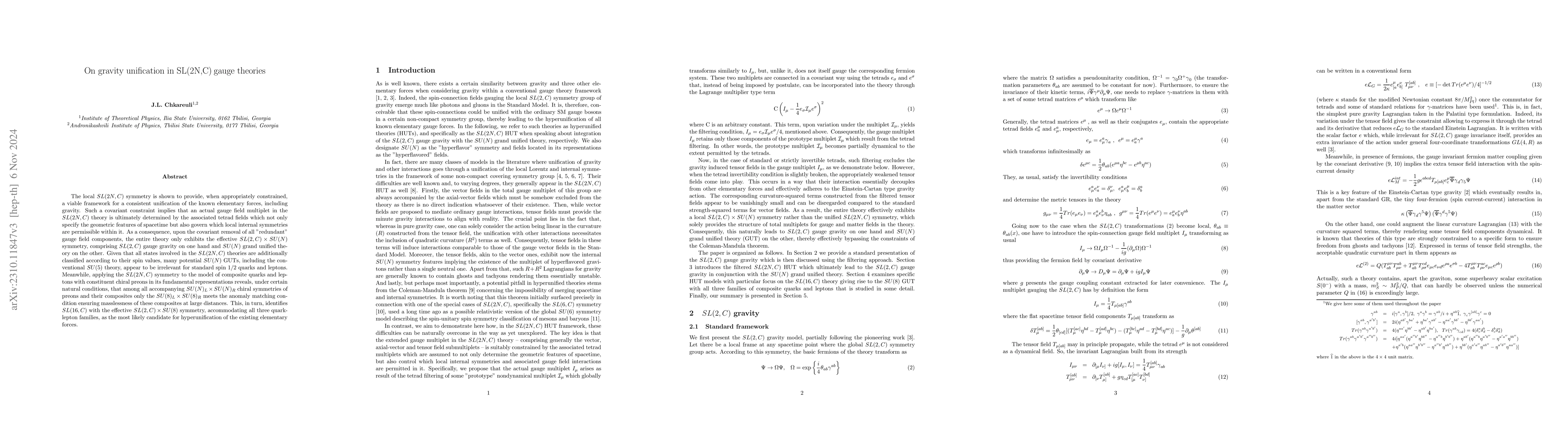 The paper proposes a unification of elementary forces within an $SL(2N,C)$ gauge theory framework, where gravity and a grand unified theory (GUT) emerge from constrained tetrad fields, ultimately reducing to $SL(2,C)\times SU(N)$ symmetry. It identifies $SL(16,C)$ as the most likely hyperunified symmetry, aligning with the anomaly matching condition for composite quarks and leptons.