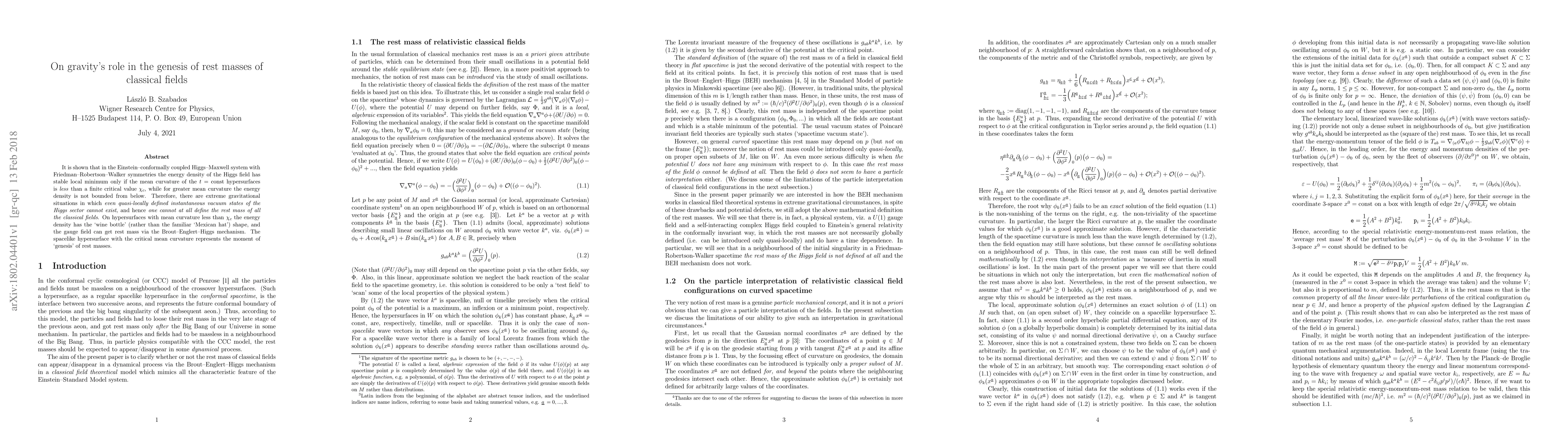 It is shown that in the Einstein-conformally coupled Higgs--Maxwell system with Friedman-Robertson-Walker symmetries the energy density of the Higgs field has stable local minimum only if the mean curvature of the $t={\rm const}$ hypersurfaces is less than a finite critical value $\chi_c$, while for greater mean curvature the energy density is not bounded from below. Therefore, there are extreme gravitational situations in which even quasi-locally defined instantaneous vacuum states of the Higgs sector cannot exist, and hence one cannot at all define the rest mass of all the classical fields. On hypersurfaces with mean curvature less than $\chi_c$ the energy density has the `wine bottle' (rather than the familiar `Mexican hat') shape, and the gauge field can get rest mass via the Brout--Englert--Higgs mechanism. The spacelike hypersurface with the critical mean curvature represents the moment of `genesis' of rest masses.