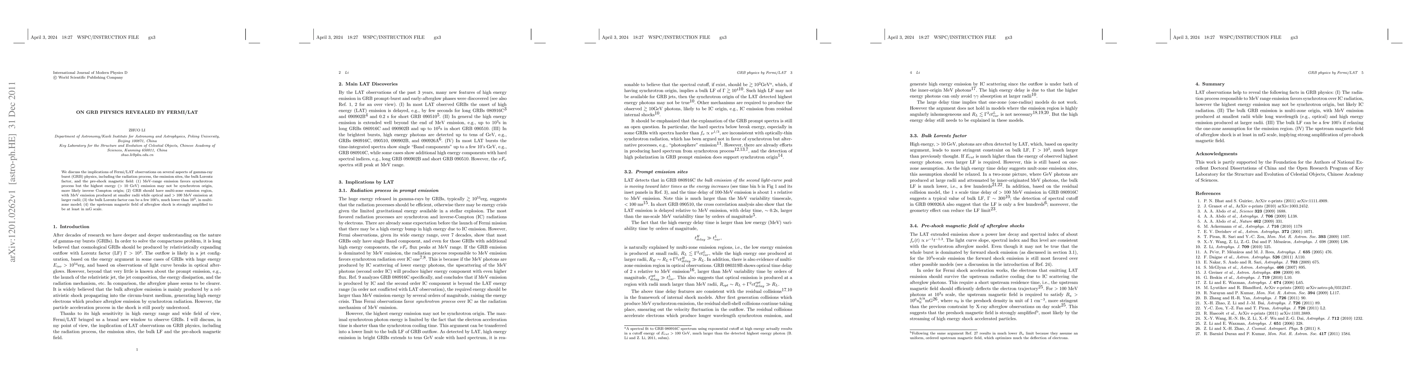 Fermi/LAT observations suggest that GRB MeV emission is likely synchrotron, while >10GeV may be inverse Compton. GRBs have multi-zone emission regions with varying radii for different energies. The bulk Lorentz factor is estimated to be lower (hundreds) than previously thought, and the pre-shock magnetic field is strongly amplified to mG scale.